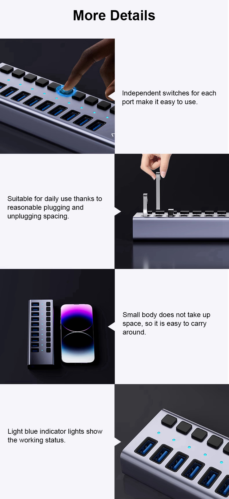 - More Details: Independent switches for each port make it easy to use. Suitable for daily use thanks to reasonable plugging and unplugging spacing. Small body does not take up space, so it is easy to carry around. Light blue indicator lights show the working status.