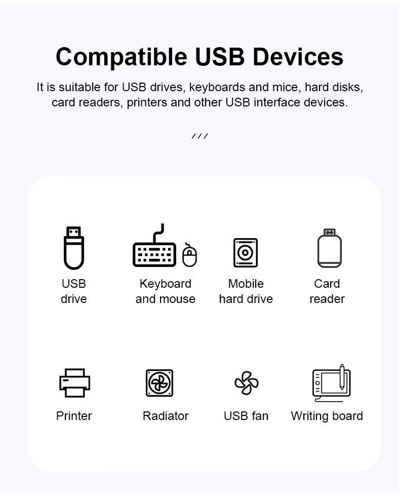 - Compatible USB Devices: Can be connected to devices such as mouse/keyboard/hard disk/USB drive/card reader/heated desk pad/radiator/graphics tablet/USB fan/gaming device.