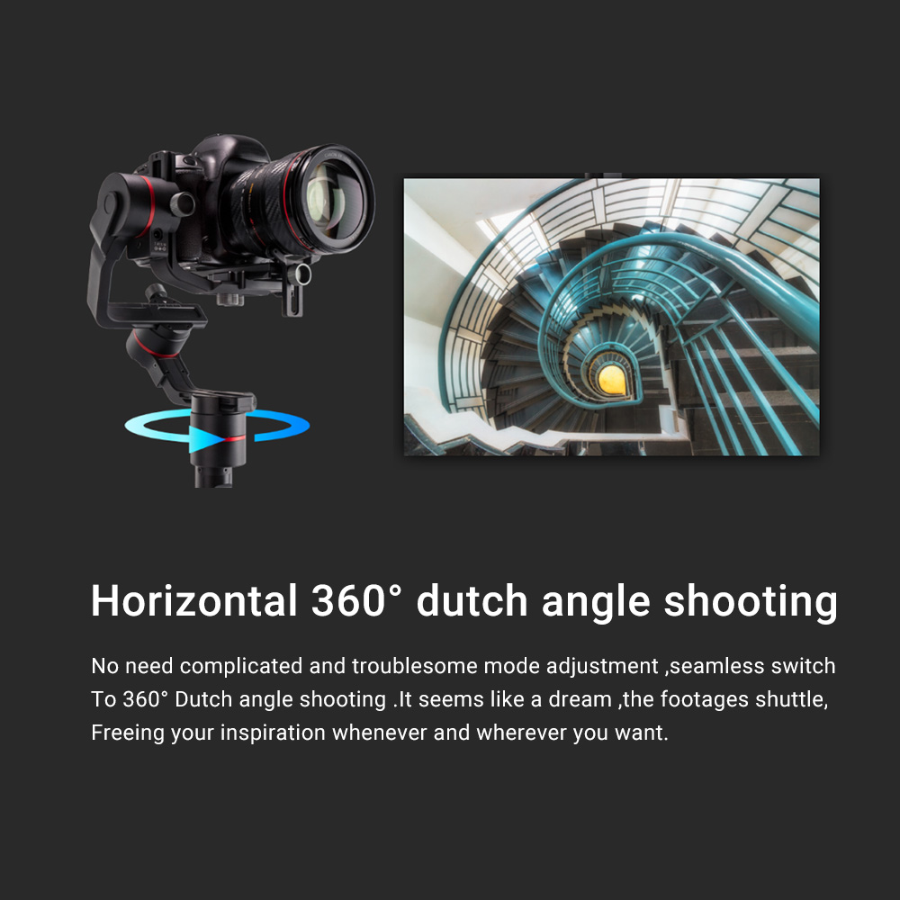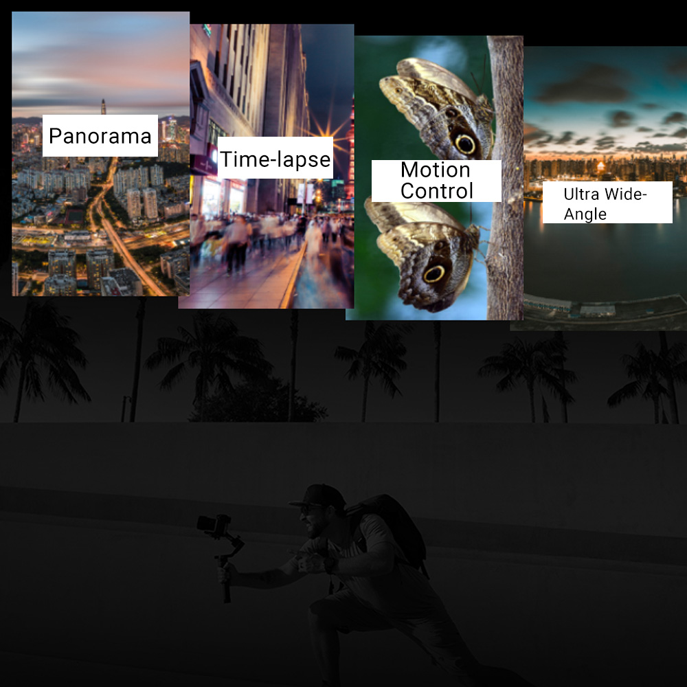 -Multiple working modes: 3-axis lock, tilt follow, selfie mode, tilt and pan follow, roll follow, 360° shooting.