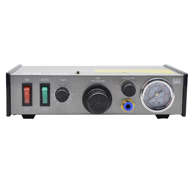 Operated by a foot pedal switch and preset timer, this automatic liquid dispenser can dispense fixed amount of glue/soldering paste to determined location via the needle and barrel.
