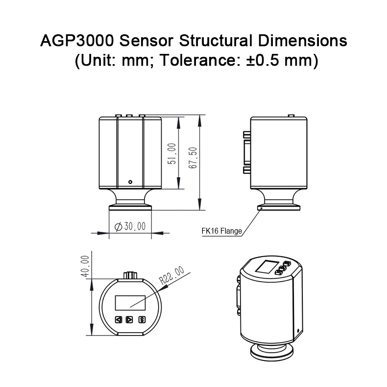 The AGP3000 is a wide-range pressure measurement Pirani composite vacuum gauge that integrates an advanced barometric sensor module and a MEMS Pirani vacuum sensor chip. The vacuum gauge is not only powerful in function but also easy to operate. It is equipped with a color LCD display (TFT-LCD) and intuitive button controls, providing analog voltage output and RS485 communication protocol, making it convenient for users to connect and exchange data with various devices and systems.