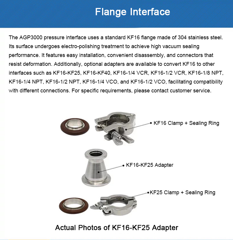 The AGP3000 supports switching among three commonly used units: Pa, Torr and mbar. It comes with a standard KF16 pressure interface and can be optionally equipped with different adapters as needed to ensure seamless connection with various devices and systems.