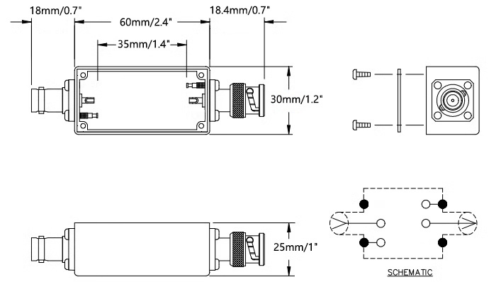 - Box size excluding BNC connectors: 60 x 30 x 25mm/2.4 x 1.2 x 1"