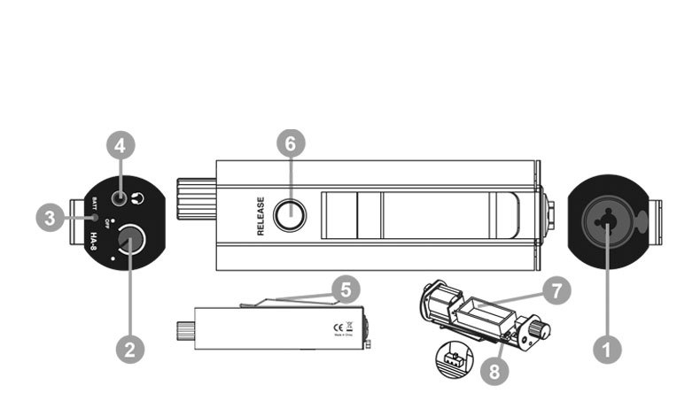 6. Battery compartment switch: press and hold this knob to push in the direction of the input.