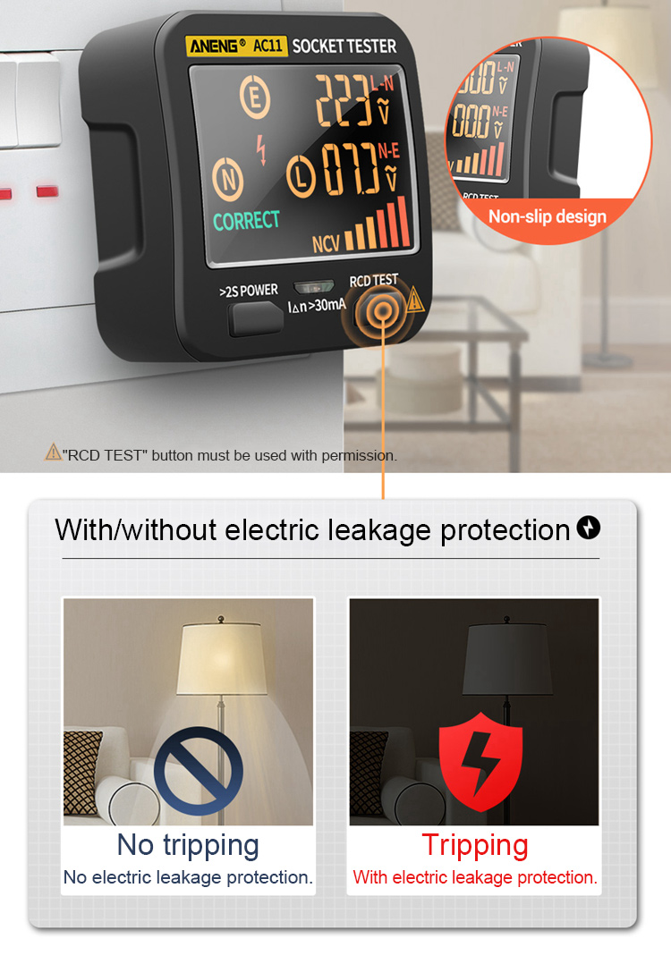 - The socket tester can be used to test electric leakage to prevent electric shock