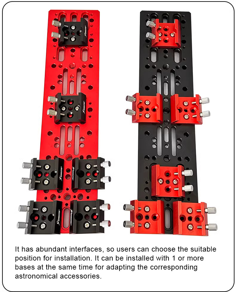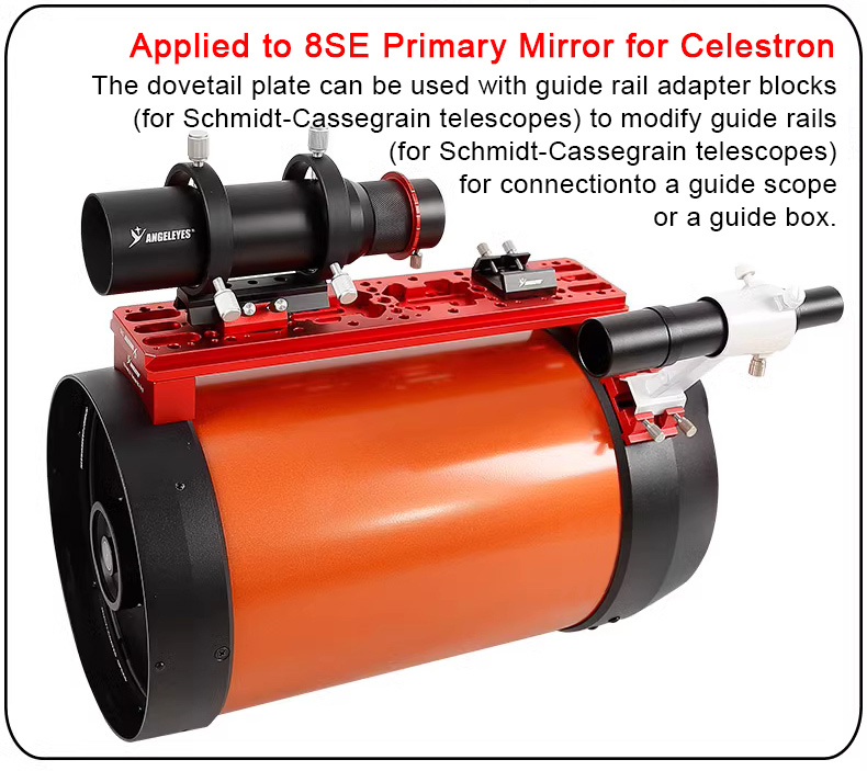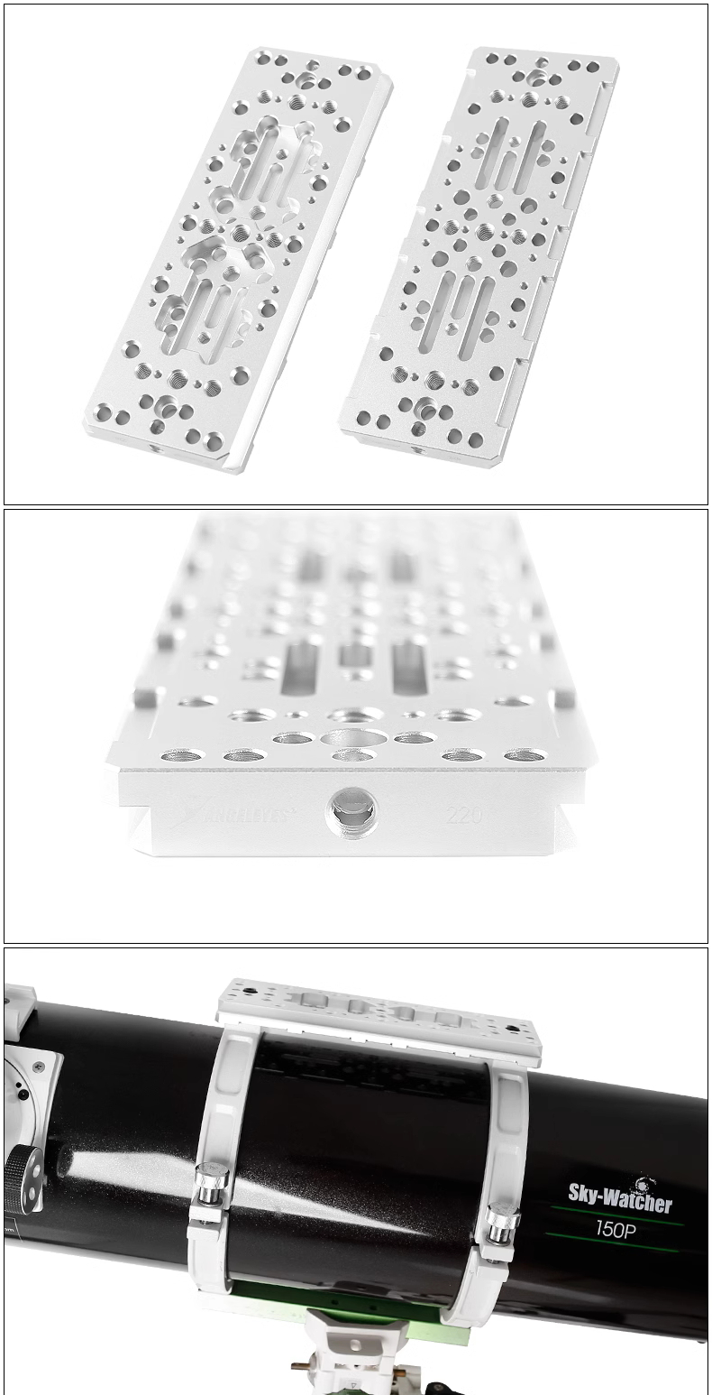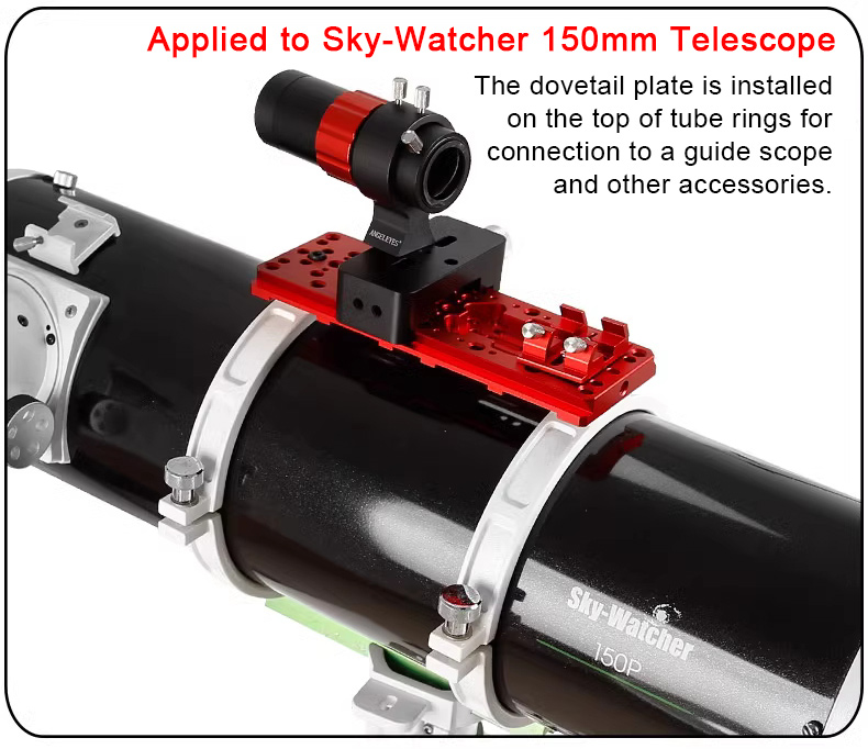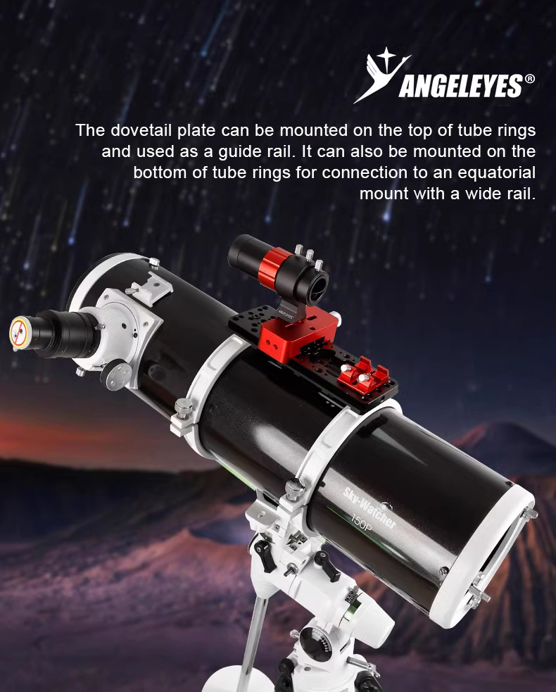 The dovetail plate can be mounted on the top of tube rings and used as a guide rail. It can also be mounted on the bottom of tube rings for connection to an equatorial mount with a wide rail.