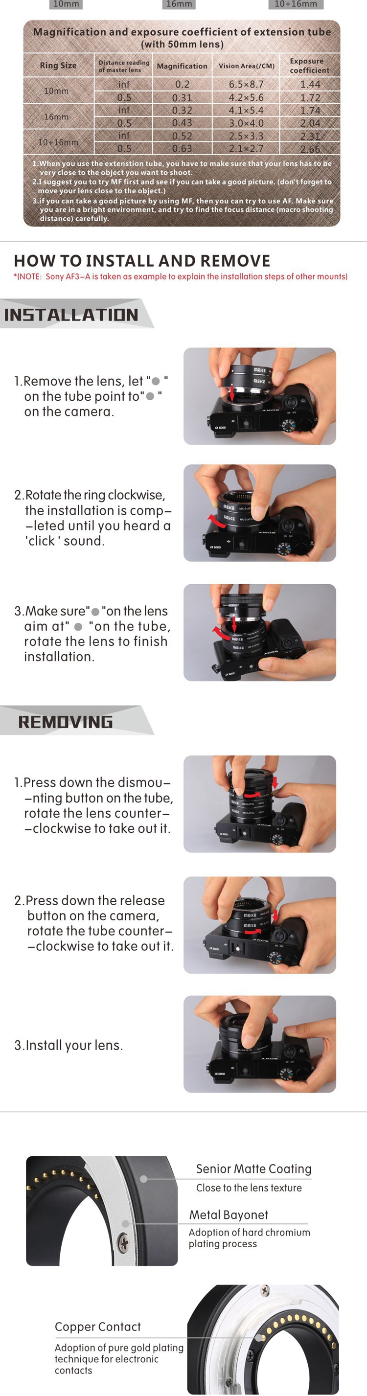 - When using the extension tubes alone (10 mm or 16 mm) or combination (10mm+16mm=26mm), the focal length of lens should be greater than the length (10mm 16mm or 26mm ) of the tube.