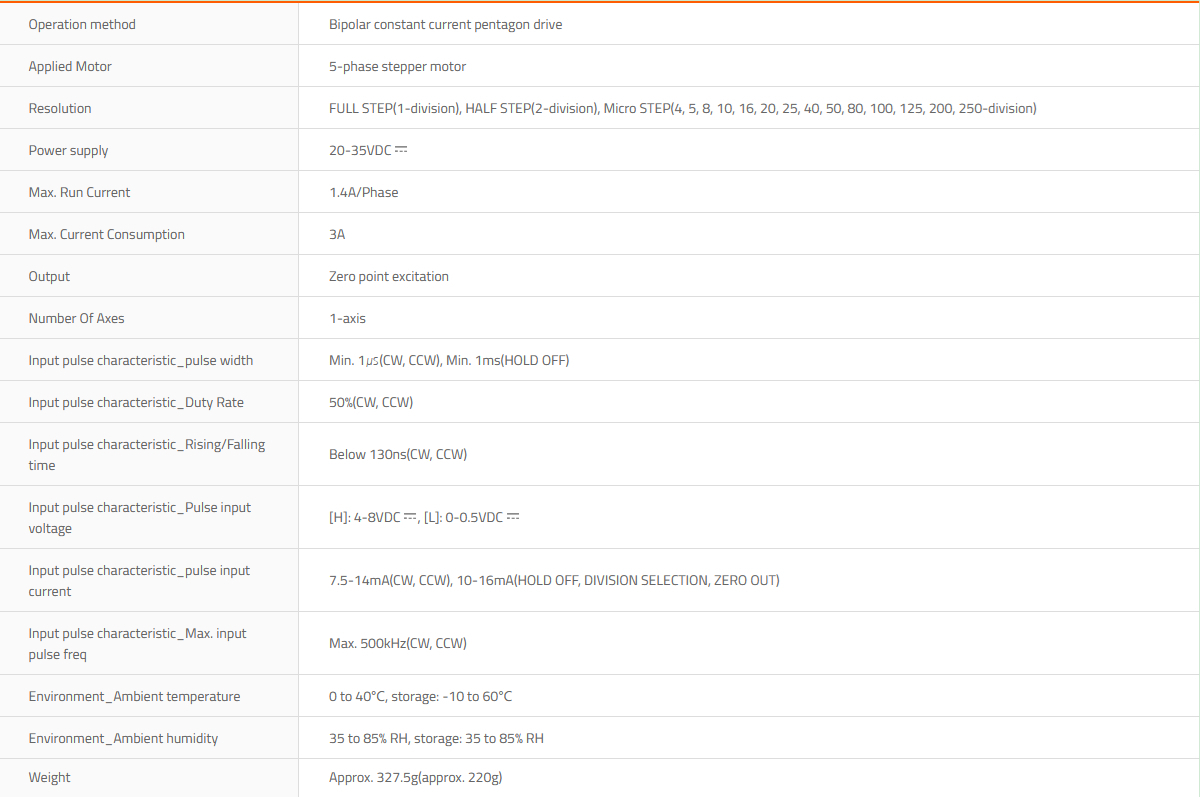 - Resolution: FULL STEP (1-division), HALF STEP (2-division), and Micro STEP (4, 5, 8, 10, 16, 20, 25, 40, 50, 80, 100, 125, 200, 250-division)