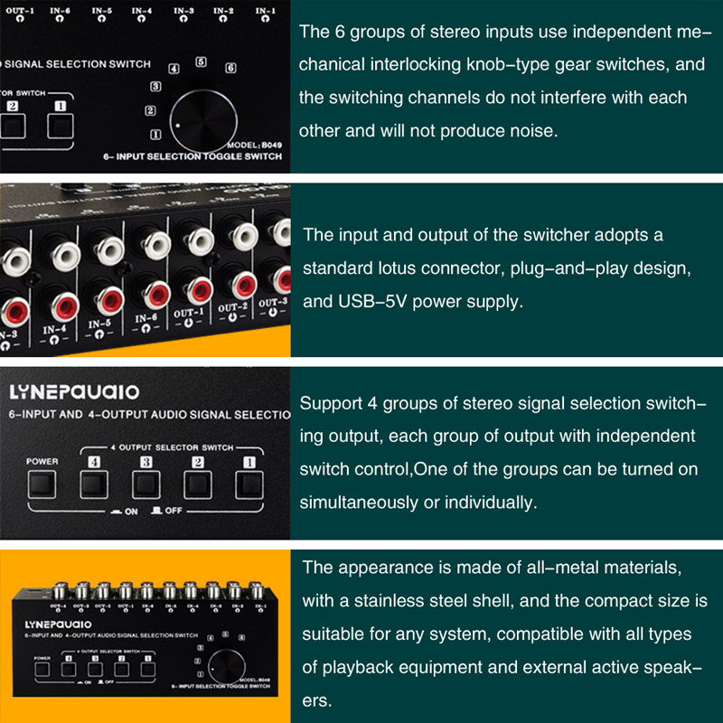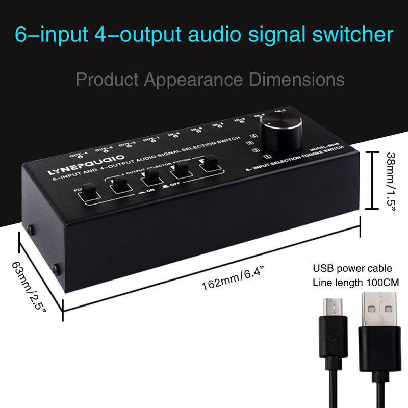 B049 6-Input 4-Output Audio Switcher Audio Source Selector Featuring Output with Separate Switches
