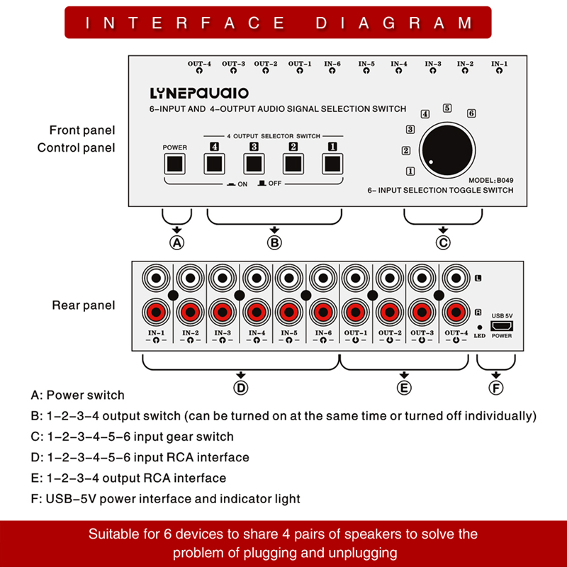 - 6 sets audio source select shift device solve the complex circuit plug in and out operation, unify connect the equipment signal source which need input to the shift device then easily convenient to select