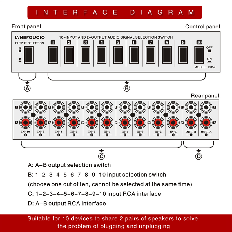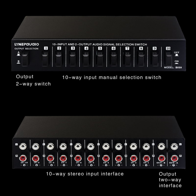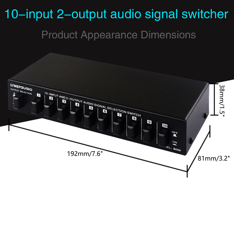 B059 Audio Switcher RCA Audio Selector 10 IN 2 OUT or 2 IN 10 OUT Lossless Bidirectional Switching