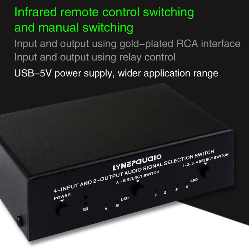 - 4 sets signal audio source select shift device solve the complex circuit plug in and out operation, unify connect the equipment signal source which need input to the shift device then easily convenient to select