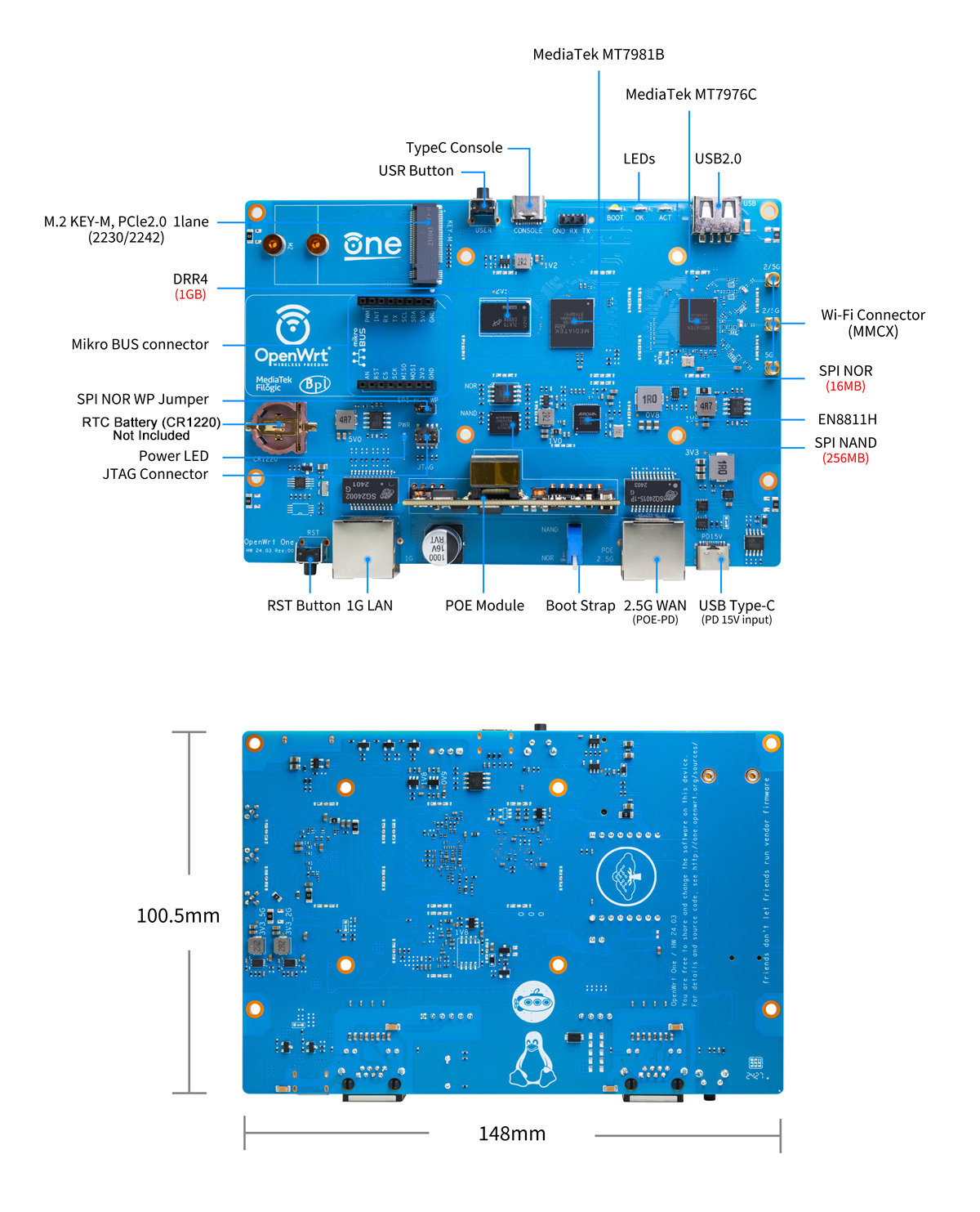 The "OpenWrt One/AP-24.XY" router board based on MediaTek MT7981B (Filogic 820) SoC and MediaTek MT7976C dual-band WiFi 6 chipset.It is the first official development board of the OpenWRT open source community