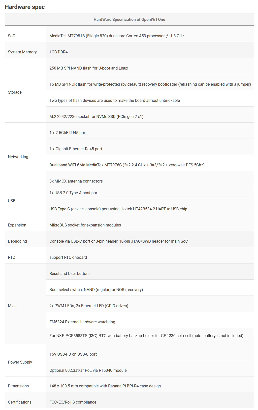 OpenWrt One uses Mediatek's MT7981B SoC with a dual-arm Cortex-a53 core at 1.3 GHz, 1 GB DDR4 RAM and 256 MiB SPI NAND storage. It also integrates 16 MiB of additional protected storage as a system backup, dual storage hardware to ensure that the onboard system is unbrickable, and finally integrated M.2. 2230/2242 NVMe PCIe 2 X1 ports can be used to add external storage. And with a battery holder for an internal clock, OpenWrt One offers a USB 2.0 Type-A and a mikroBUS expansion port to provide more interfaces to a host of technical possibilities