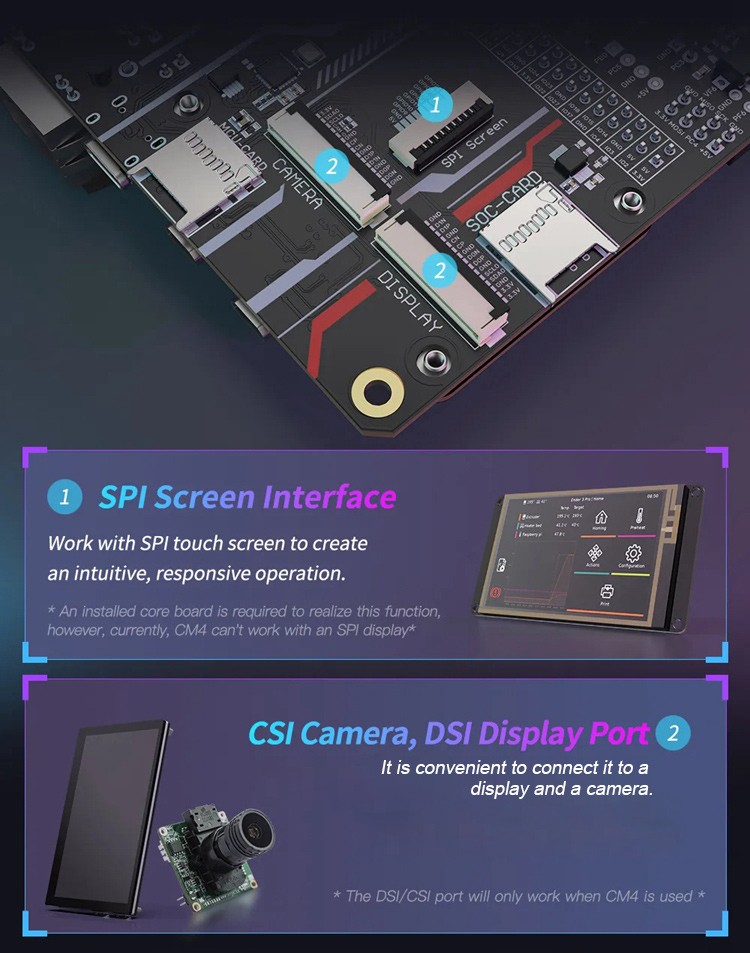 - Designed with the same connector as that of Raspberry Pi, giving you a confident connection with all versions of CM4, definitely, CB1. Also, a screw-reinforced installation is also available.