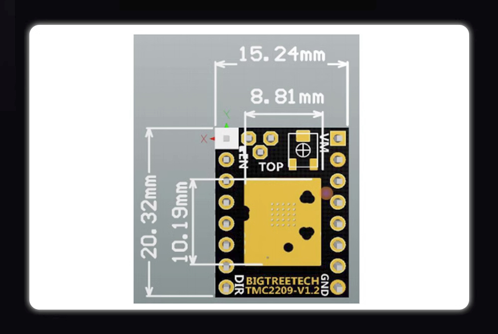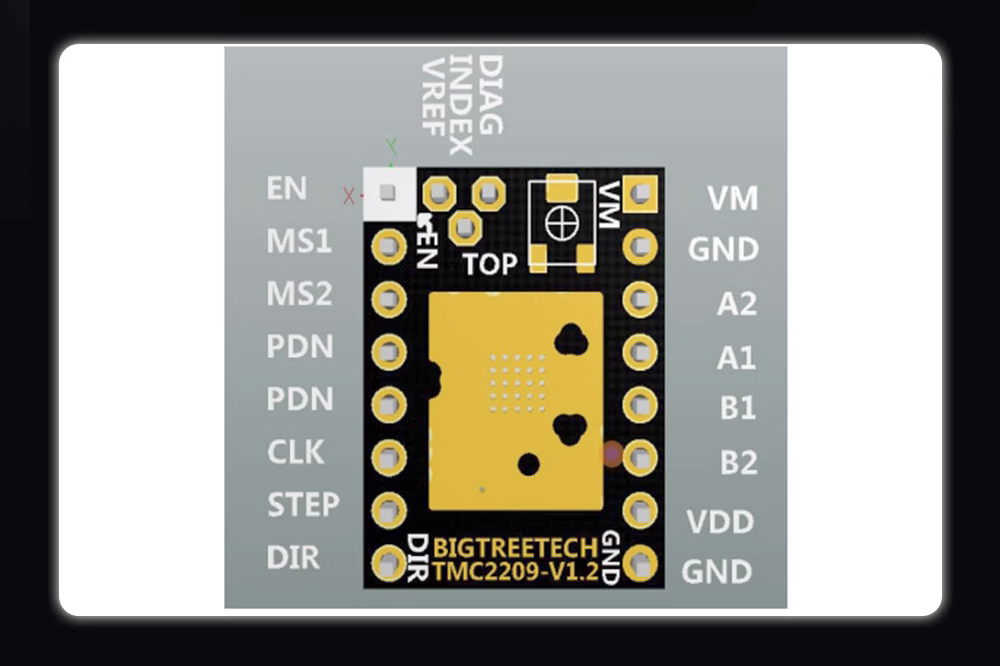 TMC2209 is an ultra-silent motor driver IC for two-phase stepper motors. Its continuous drive current is 2A and peak current is 2.8A. Compared with TMC2208, the driving current of this IC is not only improved by 0.6A-0.8A, but also this IC increases the function of locked-motor test.