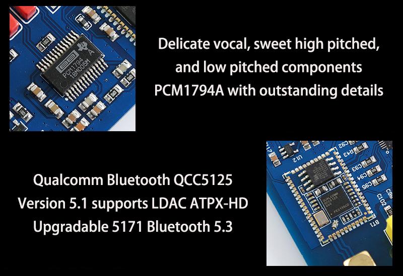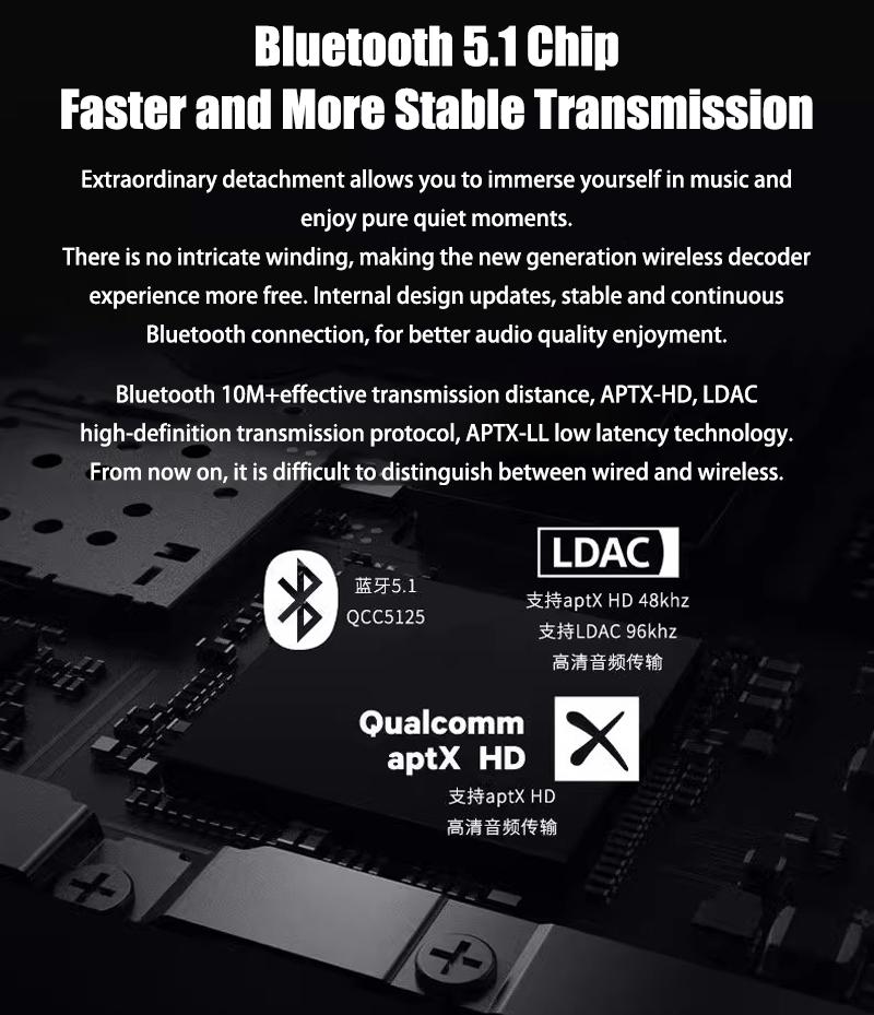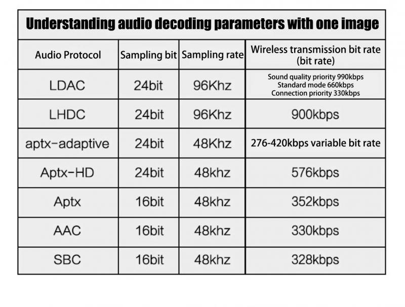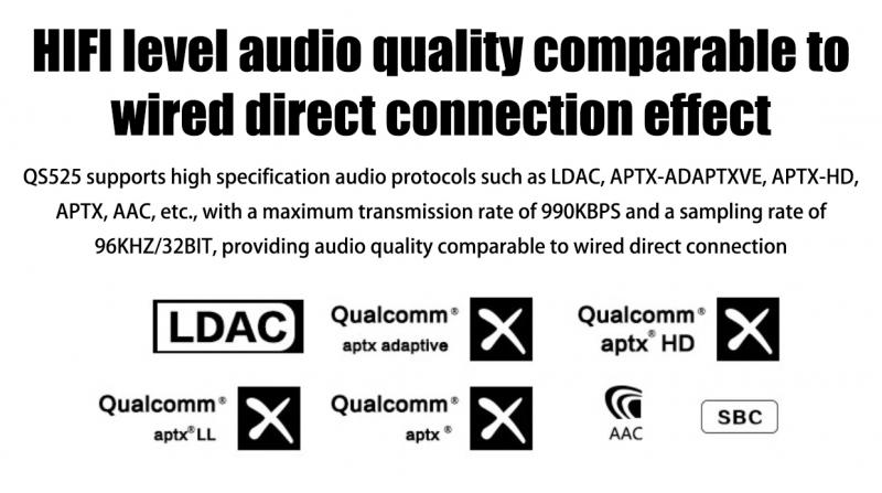 - Support for LDAC, APTX-ADAPTXVE, APTX-HD, APTX, AAC and others high specification audio protocol with a maximum transmission bit rate of 990Kbps, support 96KHz/32Bit sampling rate.