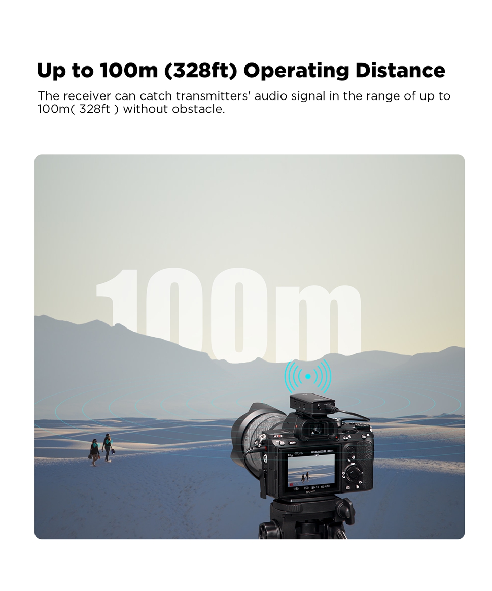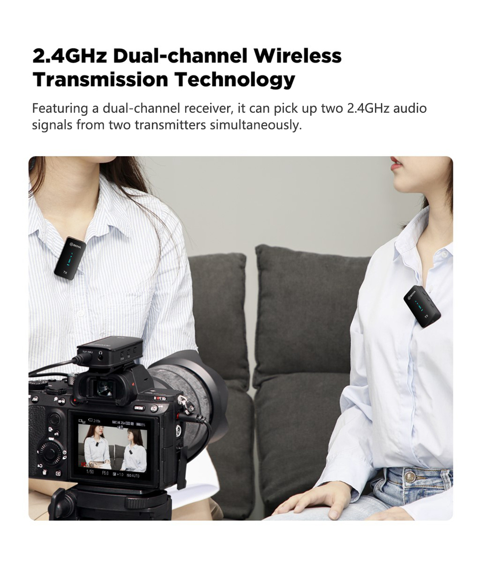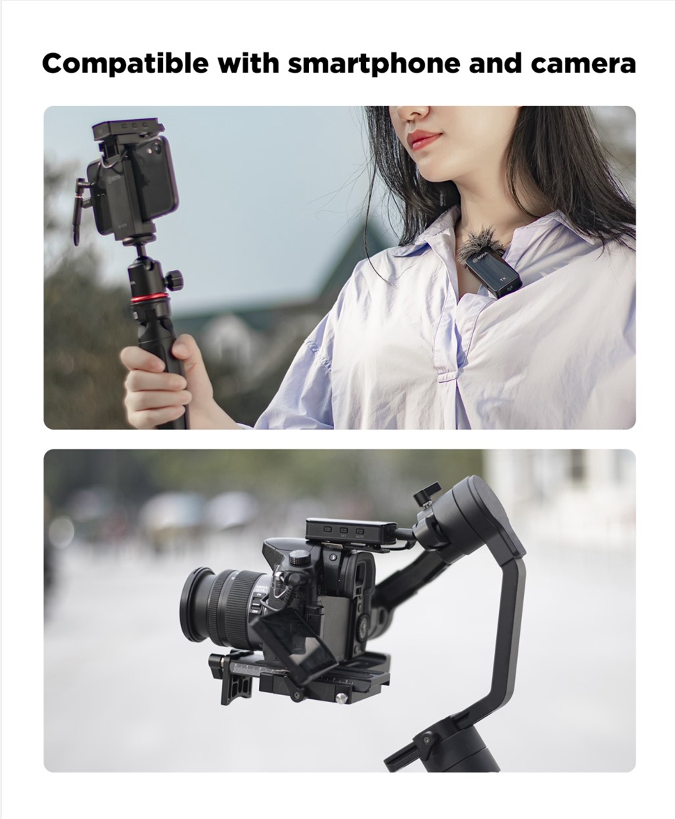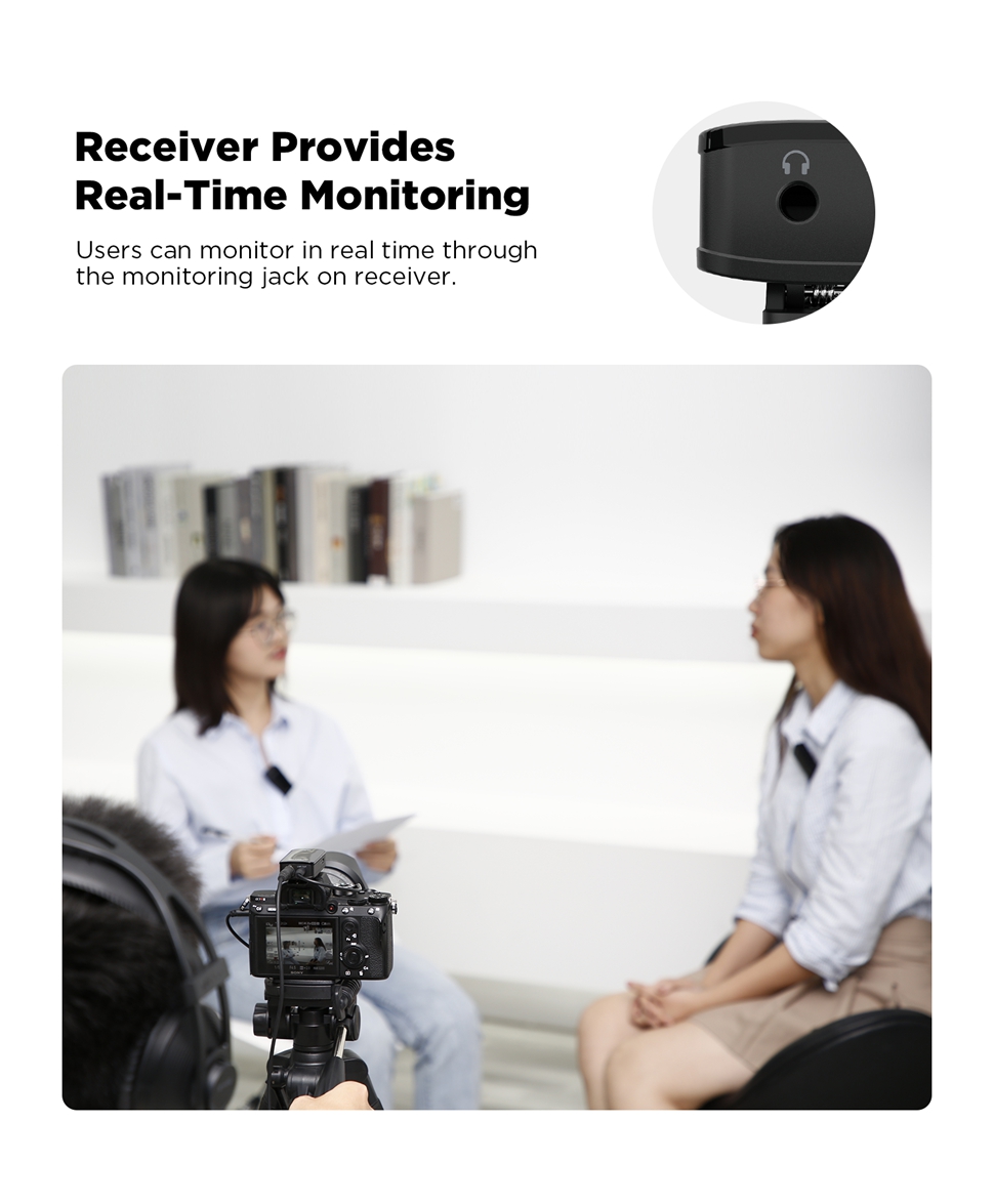 A 2.4GHz dual-channel wireless microphone system consists of two transmitters and one receiver. It's a perfect sound capturing and delivering solution for two-person vlog, YouTube video, live streaming, interview, recording, etc.