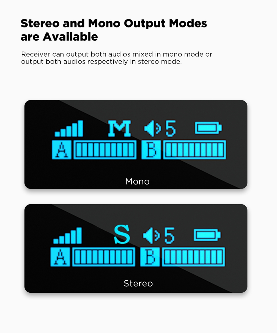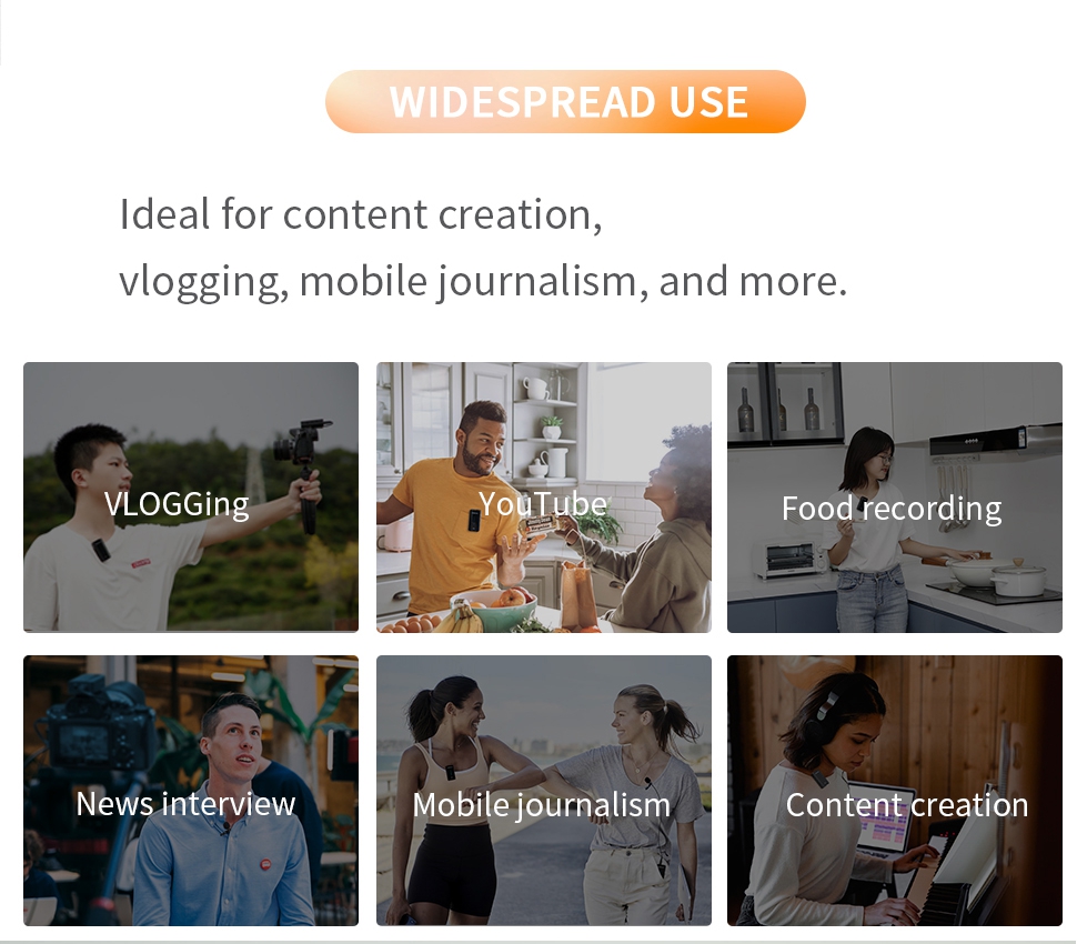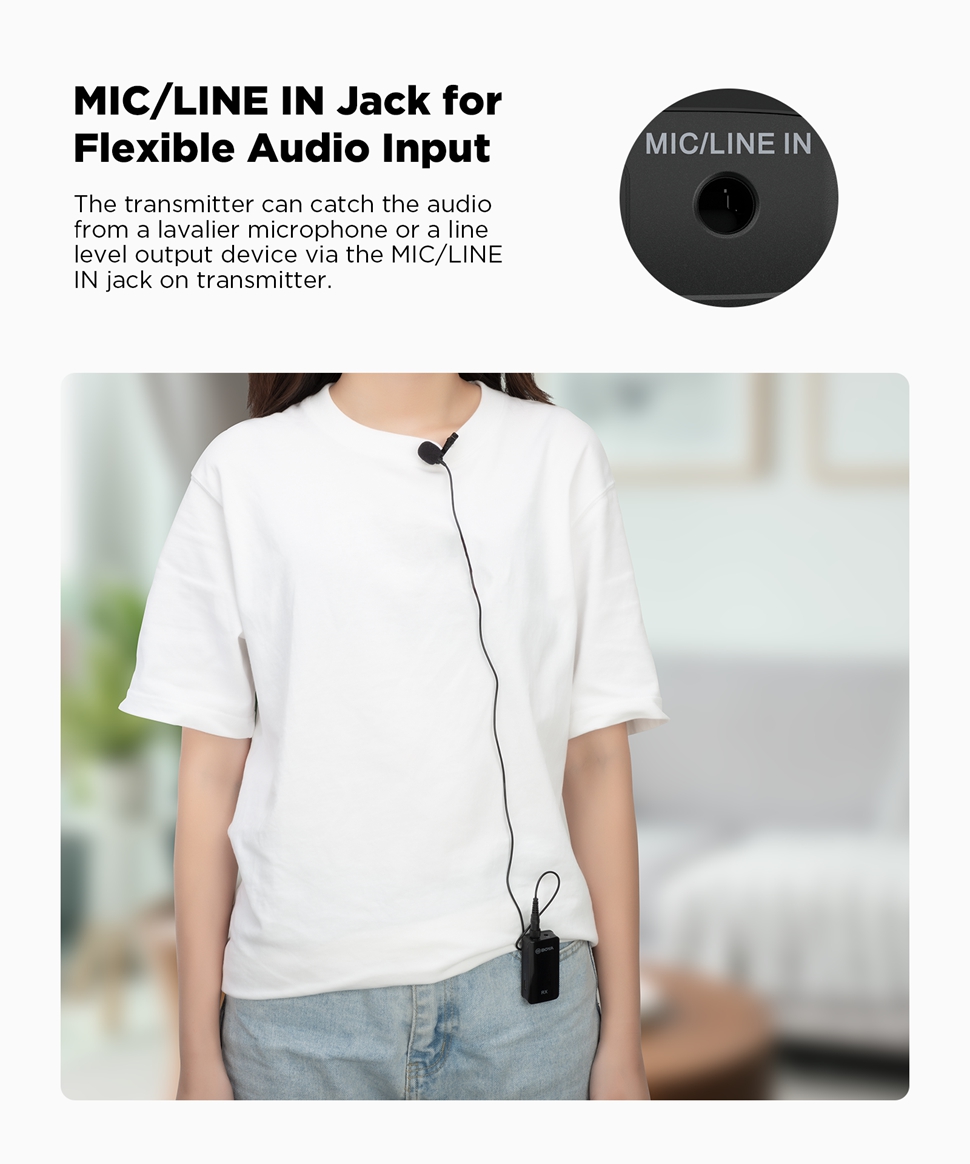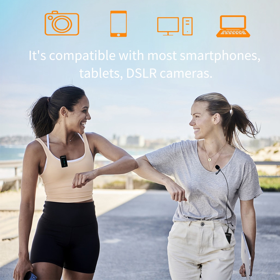 A 2.4GHz dual-channel wireless microphone system consists of two transmitters and one receiver. It's a perfect sound capturing and delivering solution for two-person vlog, YouTube video, live streaming, interview, recording, etc.