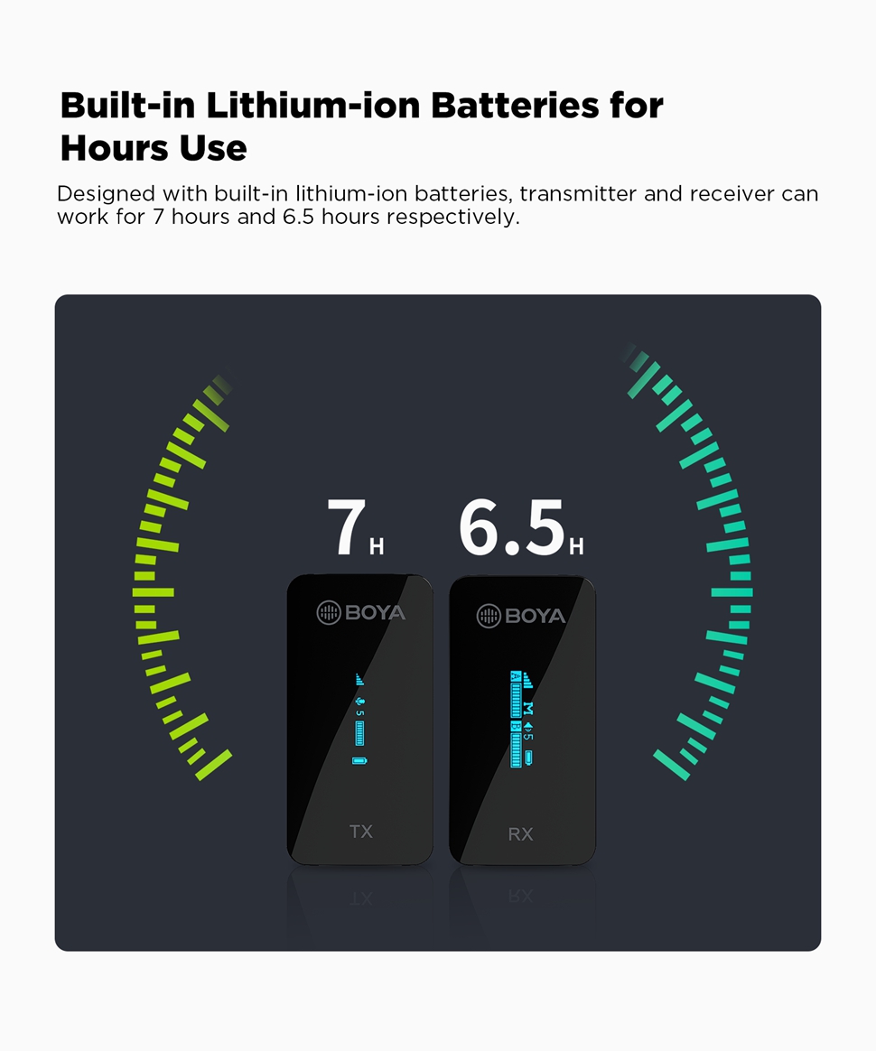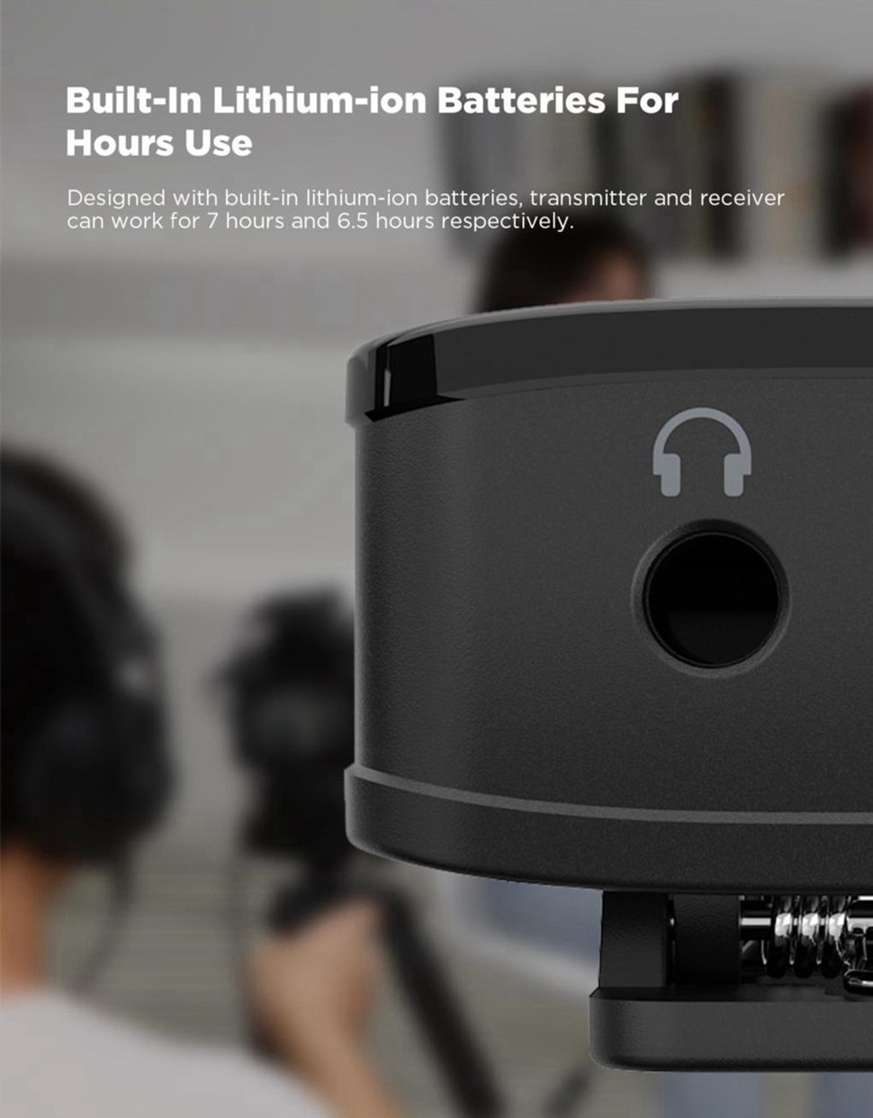 - Built-in Li-ion batteries for 7h use on transmitter and 6.5h use on receiver