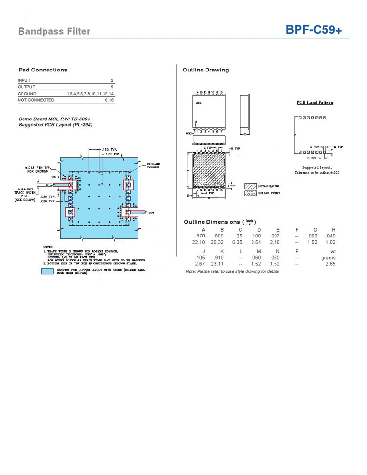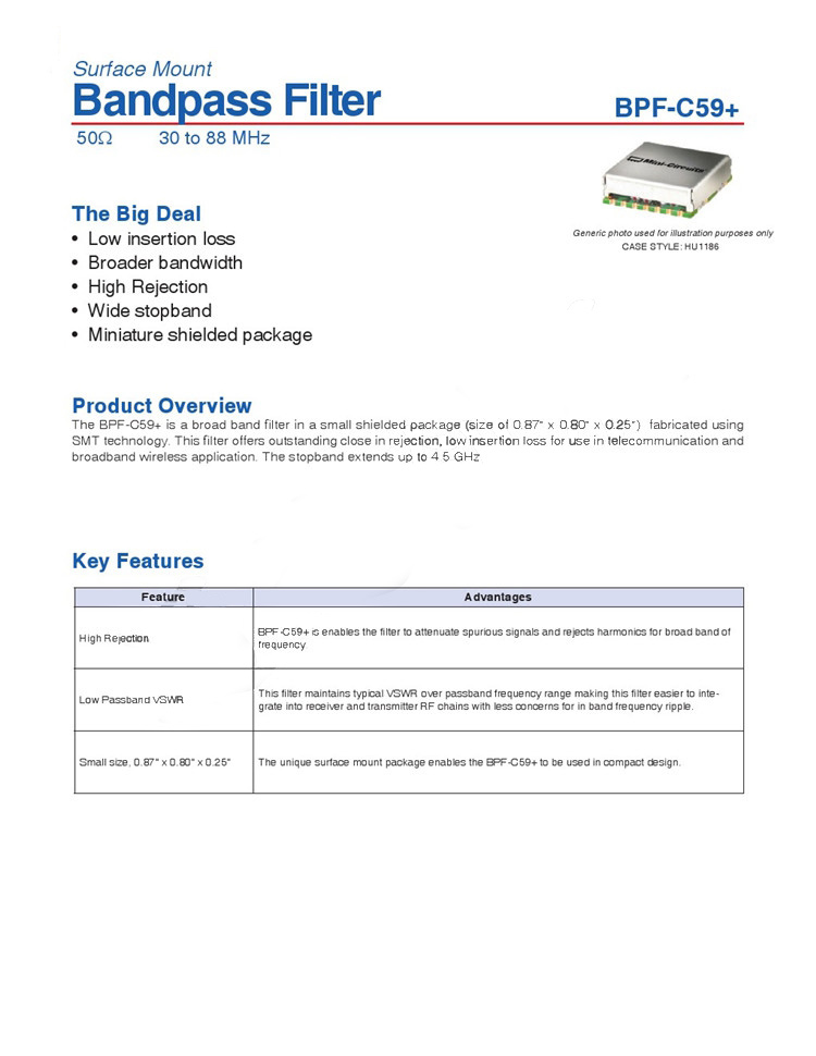 - The BPF-C59+ is a broad band filter in a small shielded package (size of 0.87” x 0.80” x 0.25”) fabricated using SMT technology. This filter offers outstanding close in rejection, low insertion loss for use in telecommunication and broadband wireless application. The stopband extends up to 4.5GHz.
