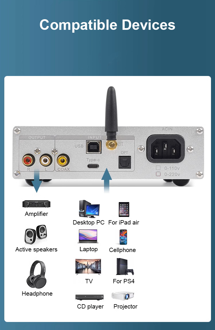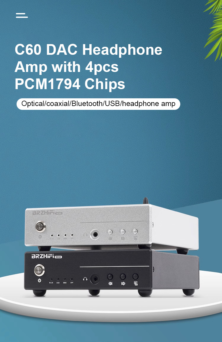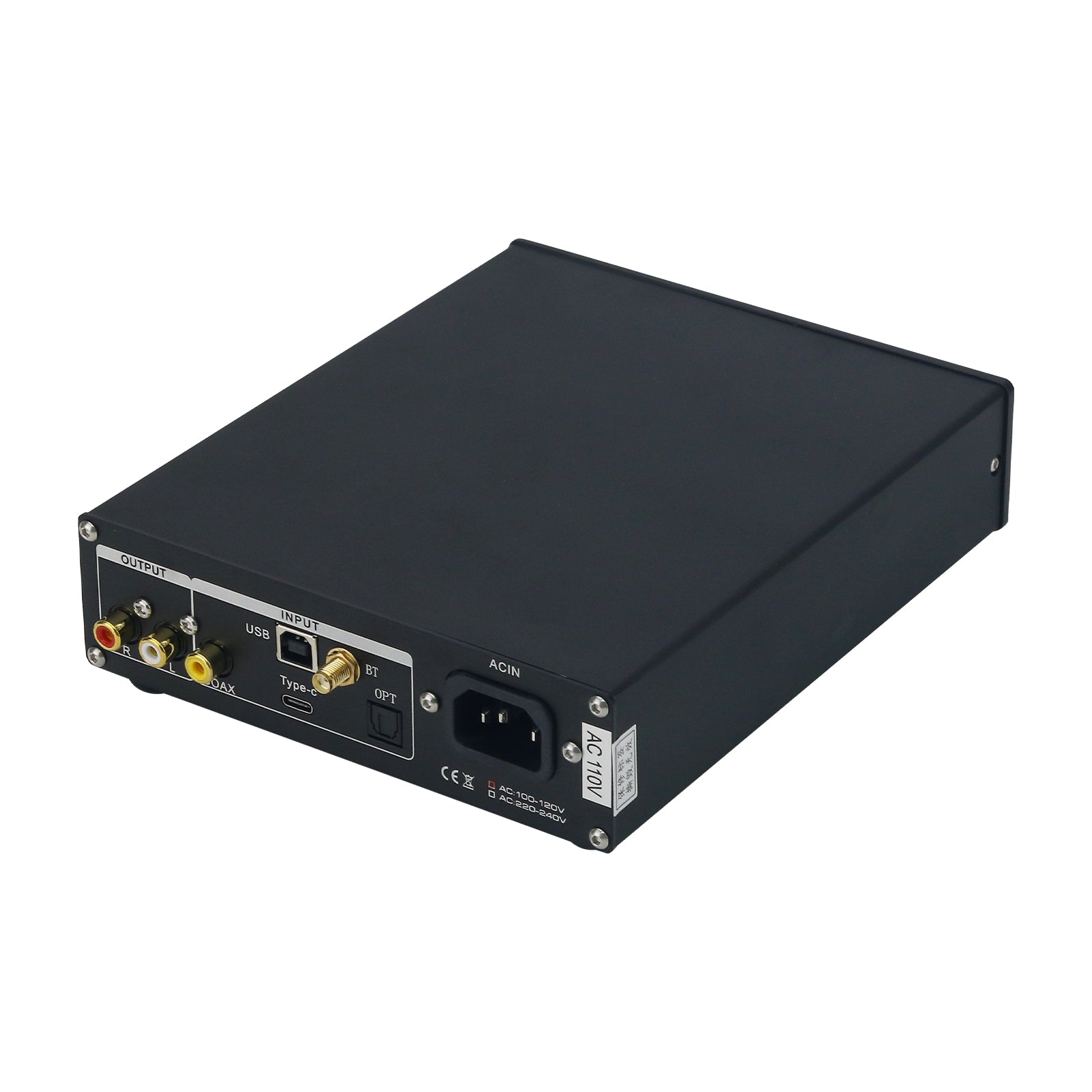 - The decoder headphone amplifier, with 4xPCM1794 chips, supports optical, coaxial, Bluetooth, and USB inputs.