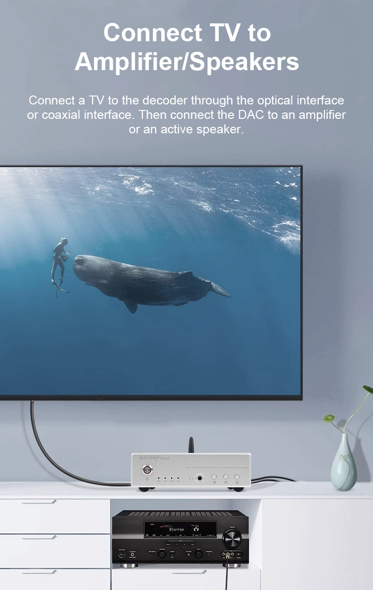 - TV connected to amplifier/speaker: Connect a TV to the decoder through the optical interface or coaxial interface. Then connect the decoder to an amplifier or an active speaker.