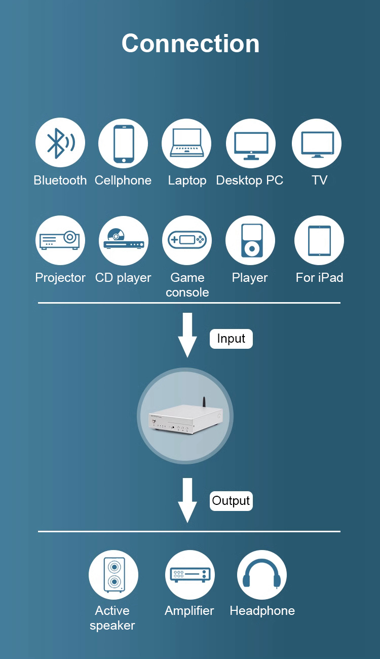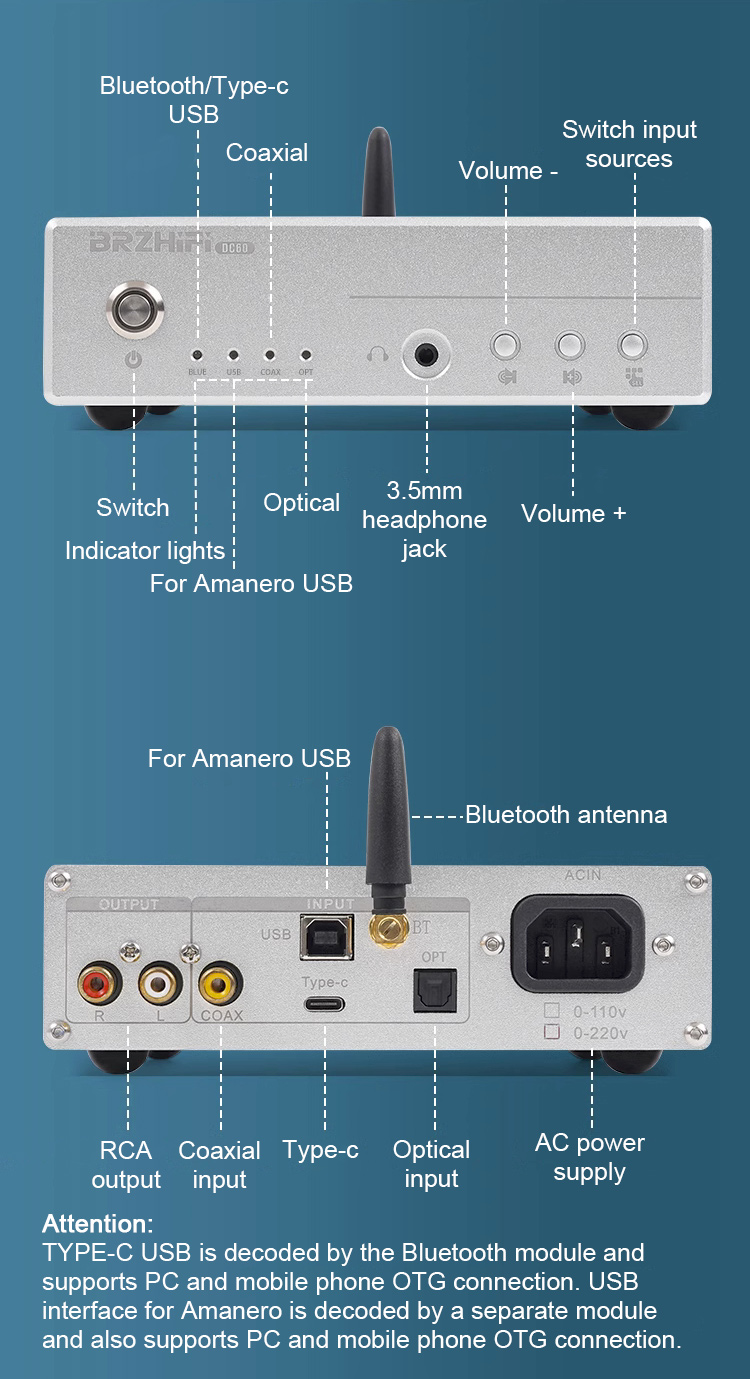 - Sampling rate: 24bit/192KHz for optical/coaxial/Amanero USB; 24bit/96KHz for Bluetooth/TYPE-C USB