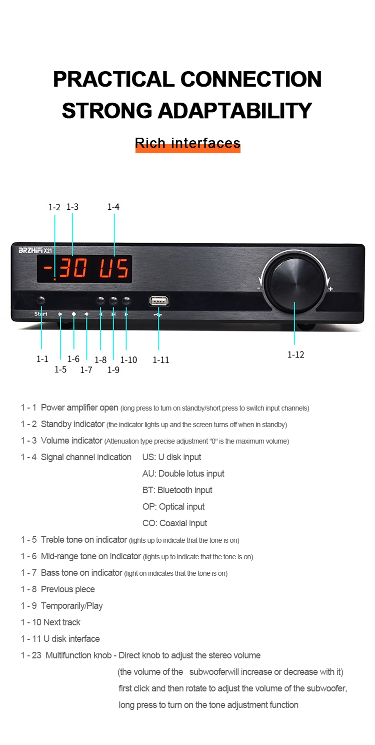 - Easy connection to various audio equipment. The power amplifier can be connected to the current mainstream audio output devices