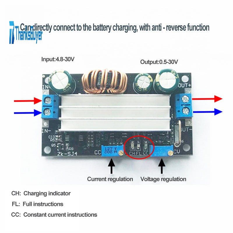 7. The module contains three indicators, constant voltage and constant current status indicator (red light is lit when in constant current mode), charging indicator (blue), fully charge indicator (Green. Current of changing indicators is 1/10 of the set current) .