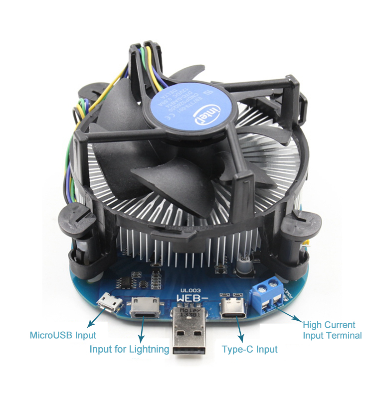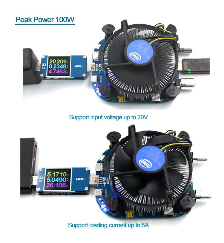 - The working voltage of our 1155 fan is 12V, the working current is 0.6A, and the power is 7.2W. If the UL003 load is used to measure 5V output charging head, once the fan is started, the operating current is 7.2W/5V=1.44A. That is to say, once the fan starts to work, the current will be around 1.4A, which will affect the measurement results. Simply speaking, when a 5V power supply is used and the fan is started, the load should be adjusted above 1.44A, so that it will have a constant current effect.