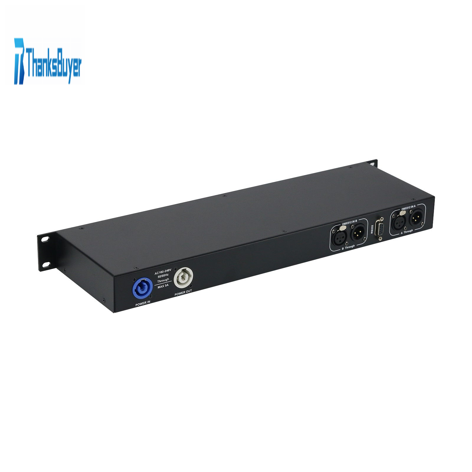* 3-in-1 DMX amplifier and signal switcher. One-out-of-two input and 8ch output; 2ch inputs independently to 4ch outputs
