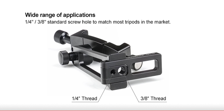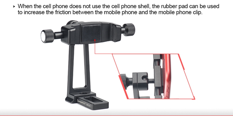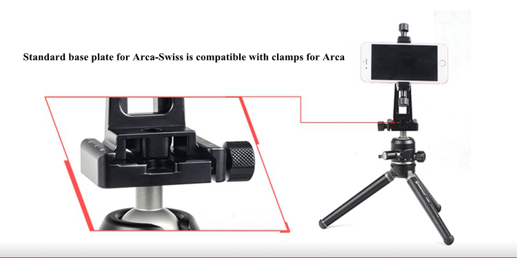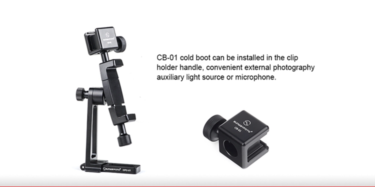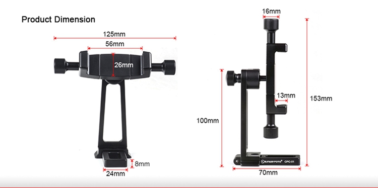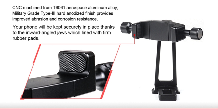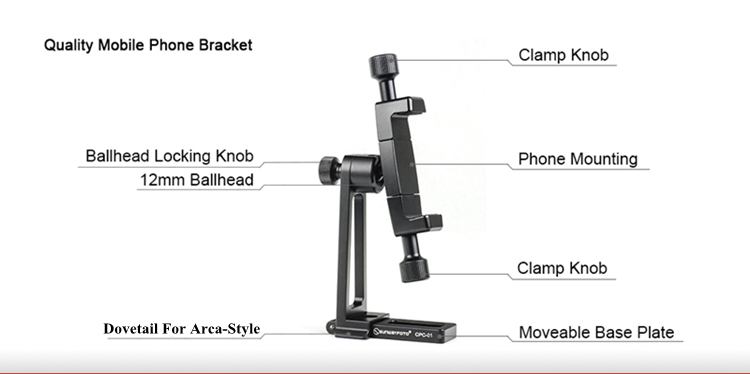 CPC-01 is one professional ball head bracket specially designed for mobile devices. Exquisitely CNC machined from T6061 aluminum alloy, military type-III hard-anodized finish. CPC-01 consists of bracket and clamp, fit for mobile phone width between 56-92mm. With CPC-01, your mobile phone can be rotated freely for different angles, and easily switch between horizontal and vertical photography. The dovetail or 1/4" / 3/8" screw hole at the base ensures CPC-01 is compatible with professional tripods to provide steadier stand for panoramic photography at night, or moving photographing etc.