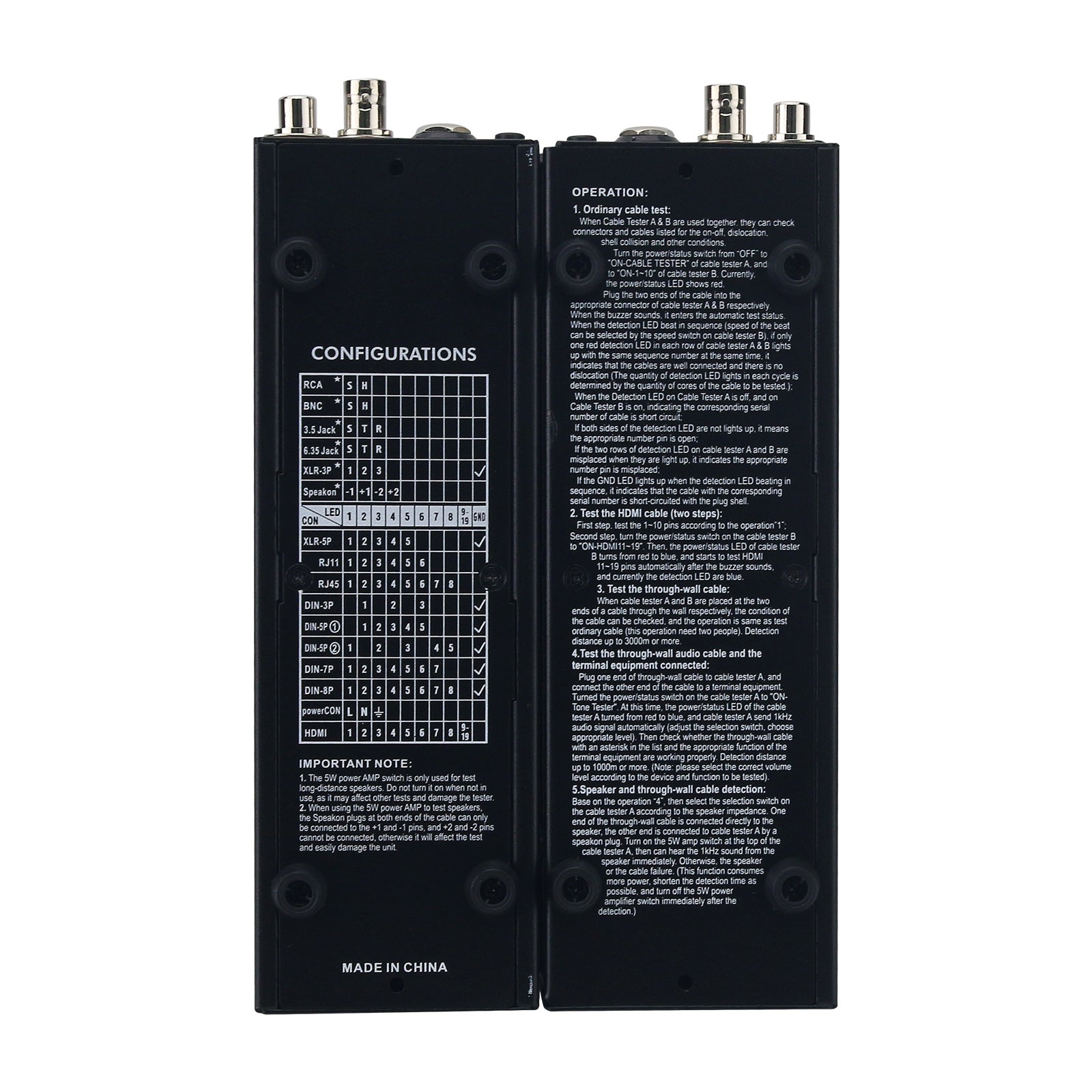 It supports cables with 16 kinds of plugs (including HDMI-compatible, for powerCON, for SPEAKON, XLR, DIN, RCA, BNC, 3.5 JACK, 6.35 JACK, RJ45 and RJ11). It can be used for continuity, misalignment and open circuit detection of cables through pipes or walls.