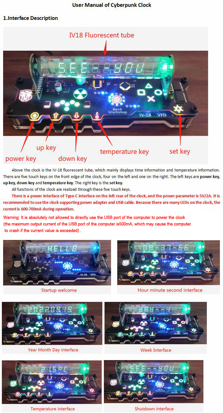 - Power supply: Type-C interface, 5V 2A (Attention: Due to the high power of RGB, it cannot be directly connected to a computer USB port)