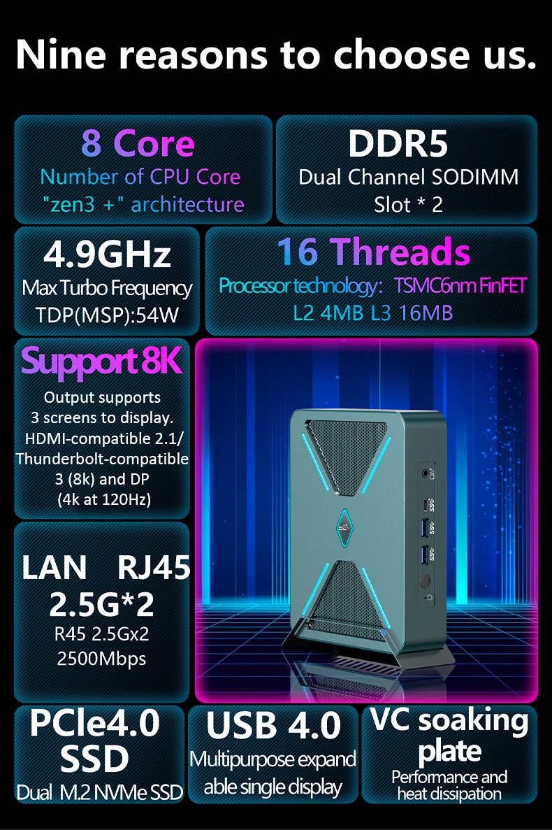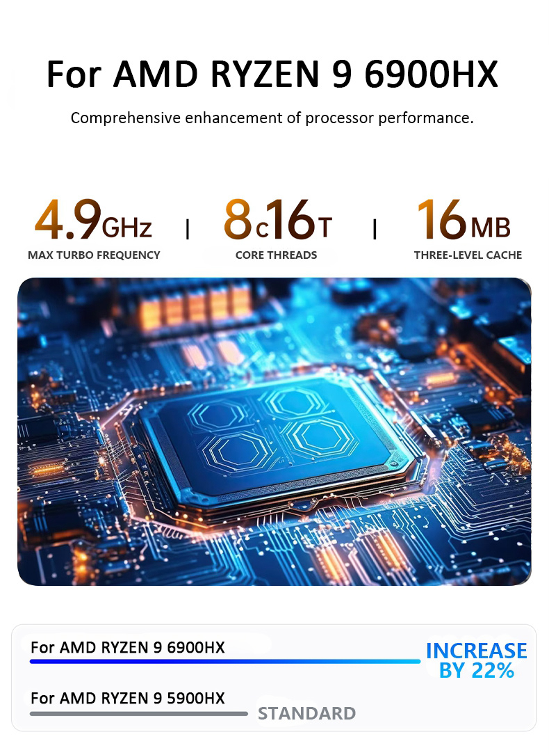 - CPU: For AMD Ryzen 9 6900HX 3.3-4.9GHz 8C/16T L2 4MB L3 16MB