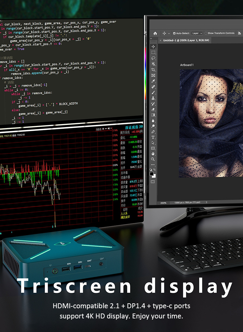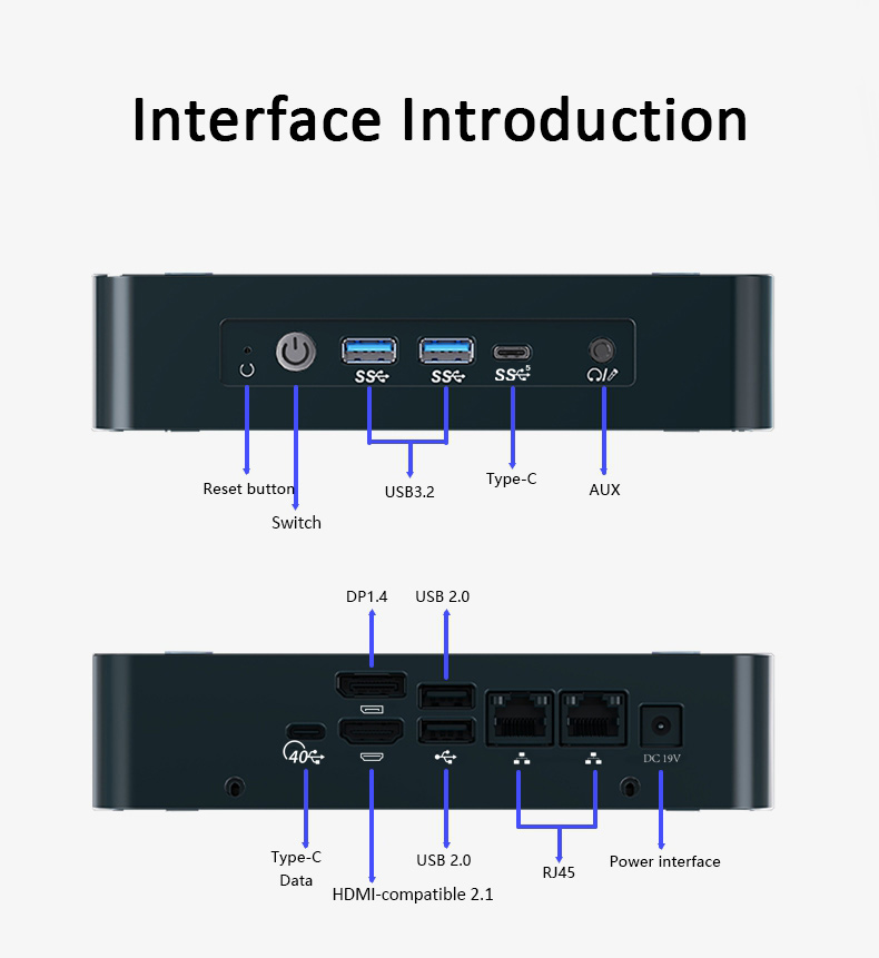 - Interfaces: Type-C USB 4.0 (Data) *1; Type-C USB3.2*1; USB3.2*2; USB2.0*2; DP1.4*1; RJ45 (2.5G)*2; HDMI-compatible 2.1*1; audio jack (HP & MIC)*1