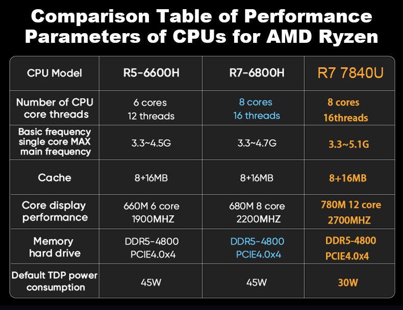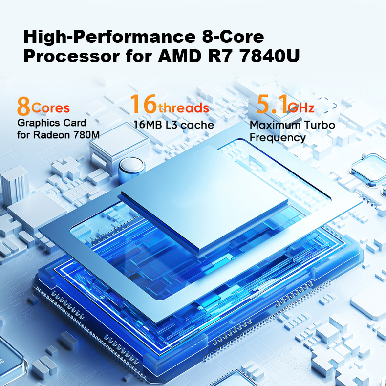 - CPU: R7 7840U processor for AMD Ryzen. Maximum turbo frequency 5.1GHz (8C/16T) 16MB level 3 smart cache