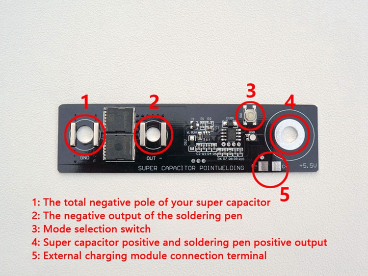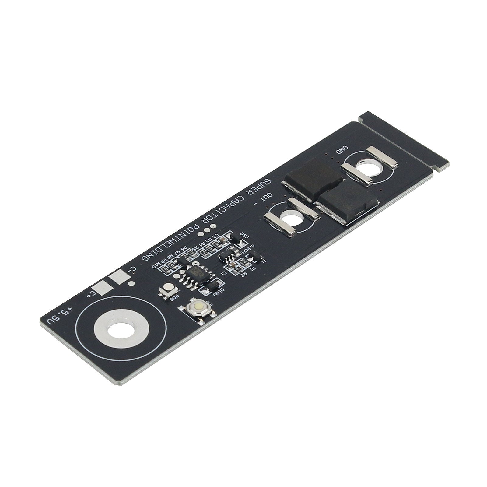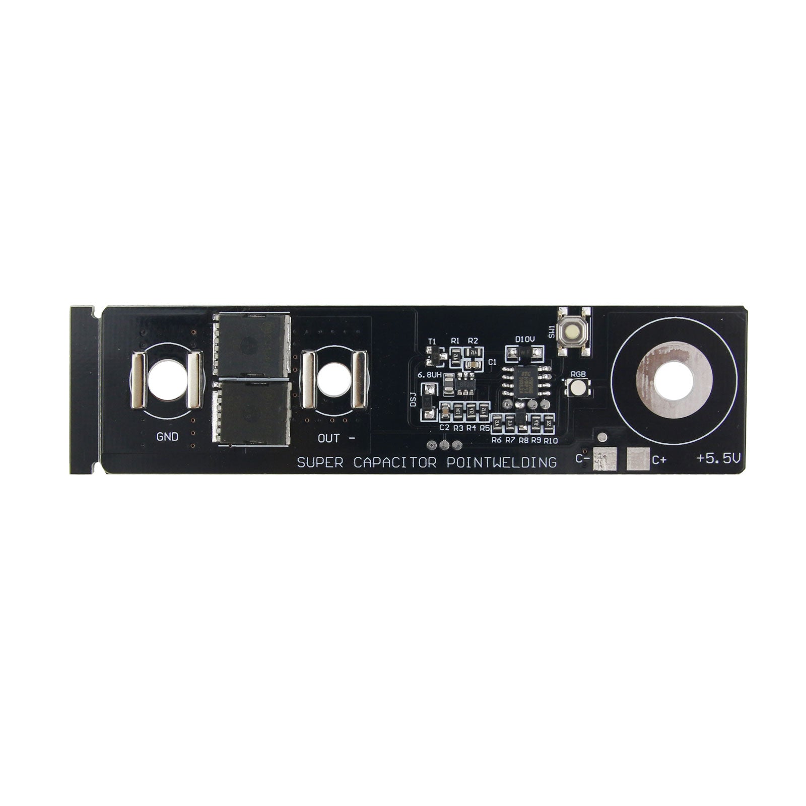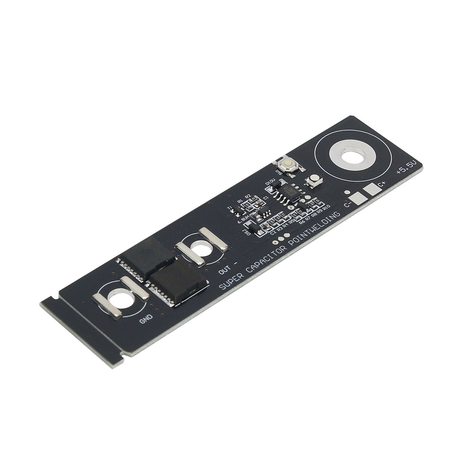 This product is suitable for connecting 2 super capacitors in series (2.8V+2.8V). It is recommended that a single capacity is 3000F or above. The circuit is precisely controlled by a MCU program. It is divided into 3 power levels. It automatically detects the contact resistance of the soldering pen and automatically triggers it. It outputs in parallel through a 300A power tube X3 and welds 0.15mm nickel plates.