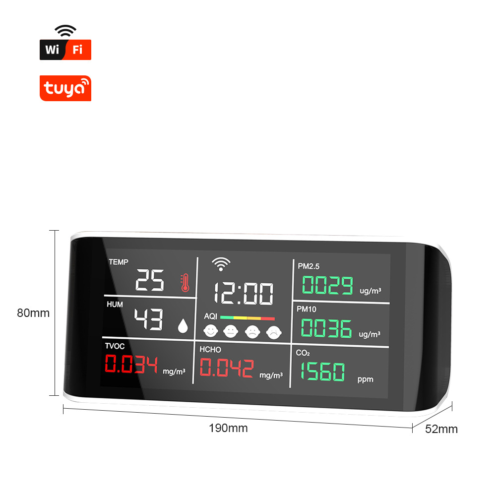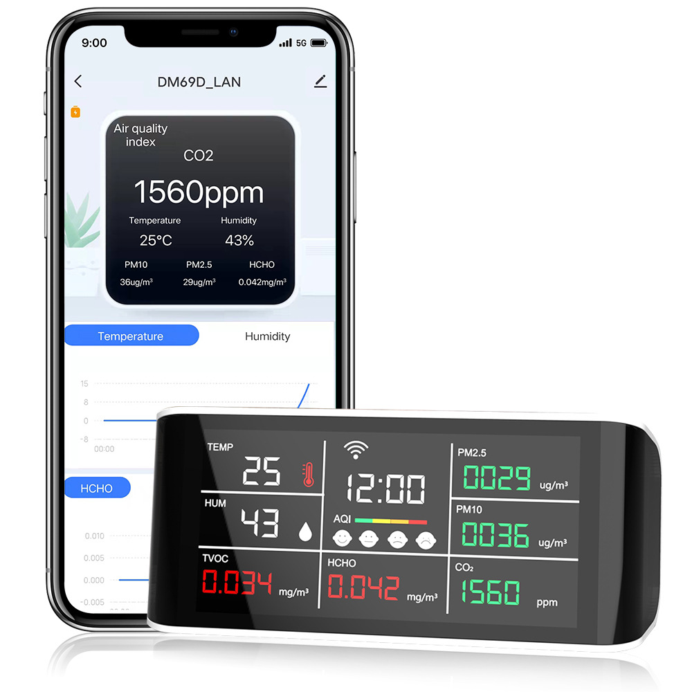 DM69D-WIFI is an advanced 9-in-1 multifunctional air quality monitor. It can detect carbon dioxide (CO2), particulate matter (PM2.5/PM10), formaldehyde (HCHO), total volatile organic compounds (TVOC), air quality index (AQI), temperature, and humidity with a time function.