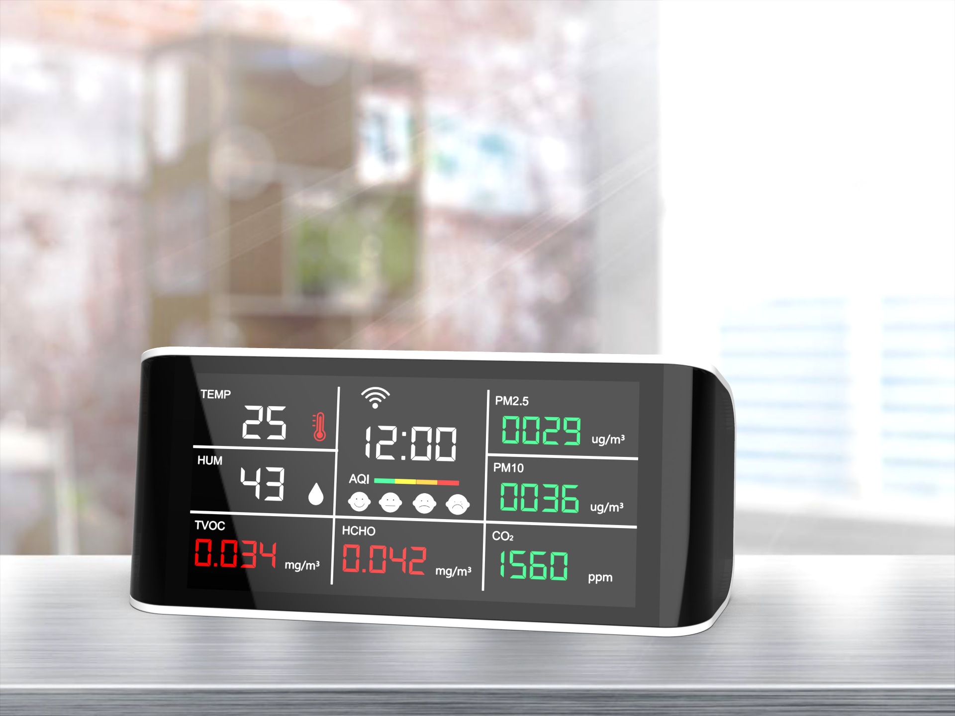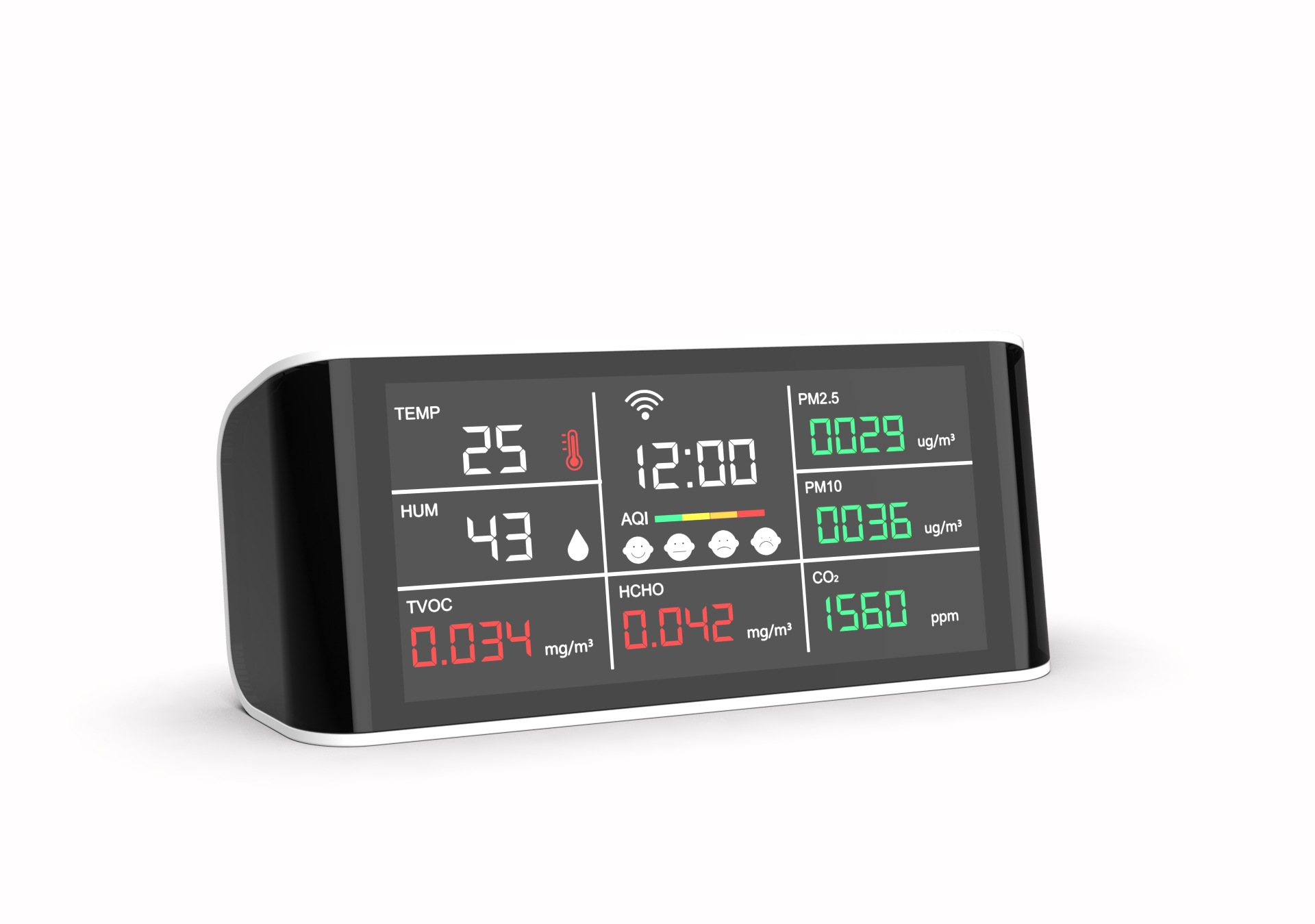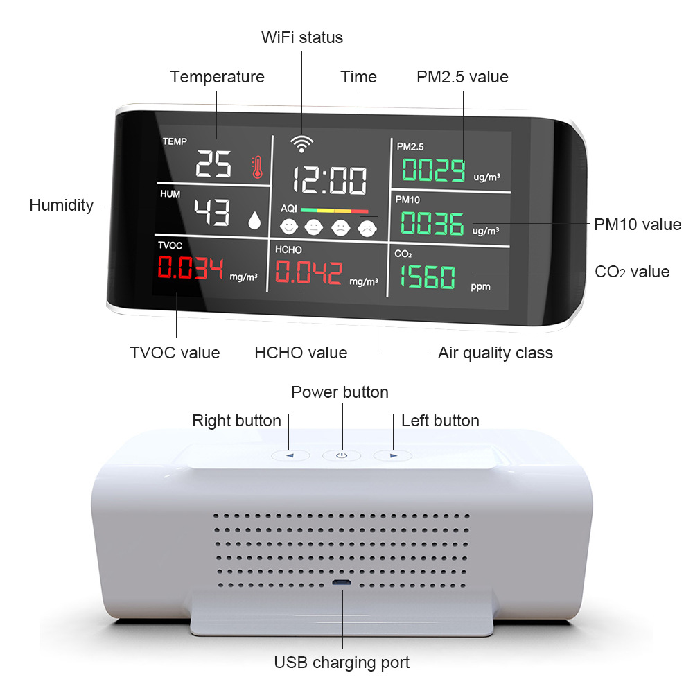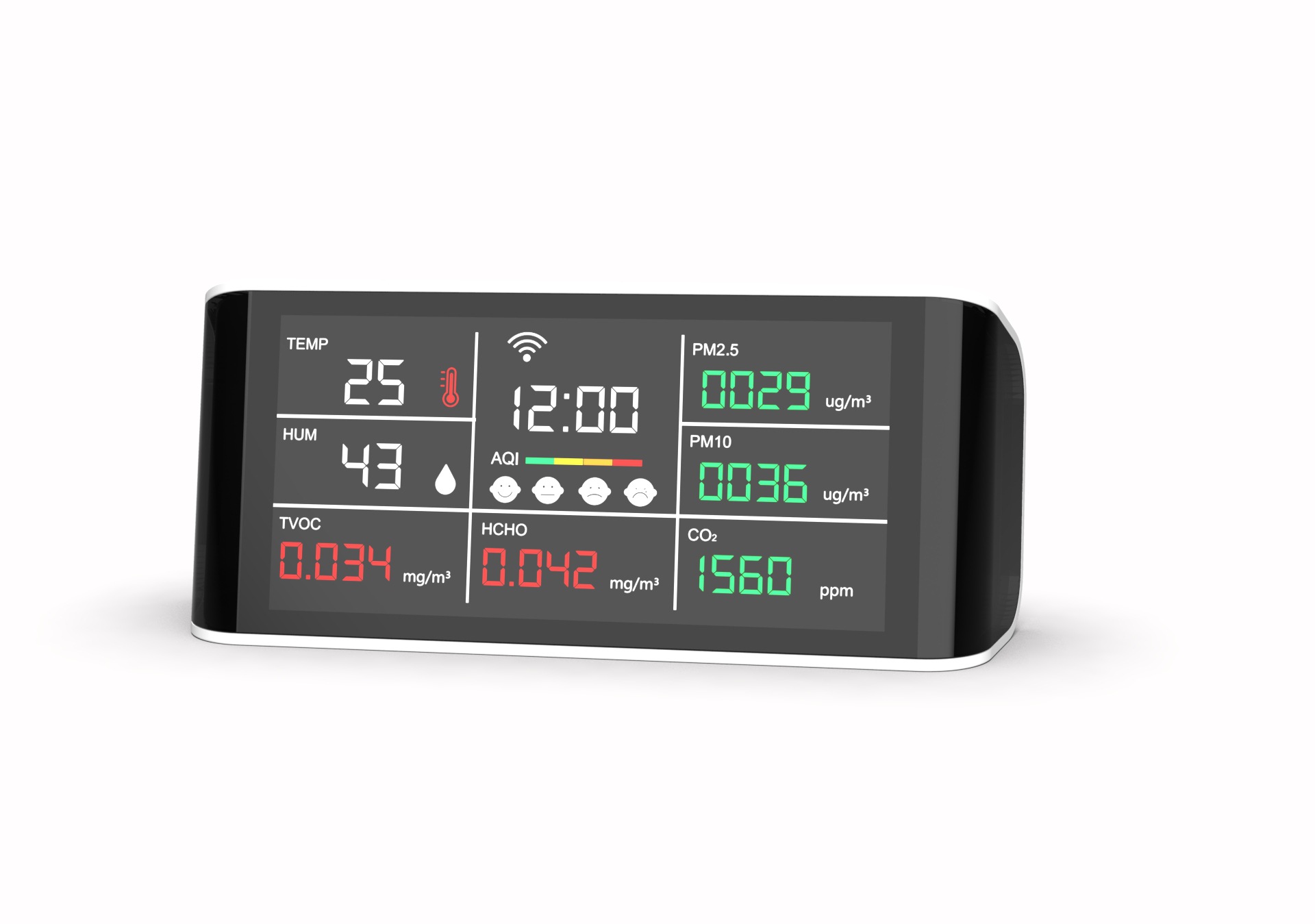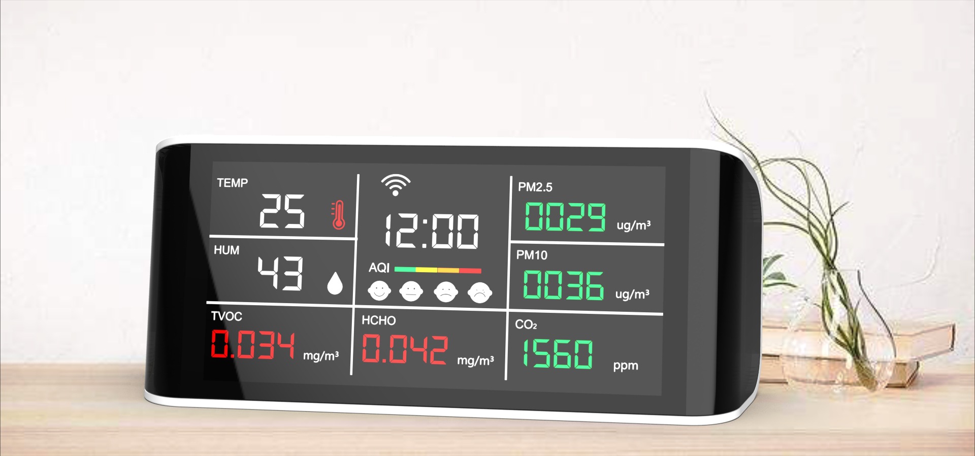 * Real-Time Monitoring: It detects CO2, PM2.5, PM10, HCHO (formaldehyde), TVOC, AQI, temperature, and humidity with time display.