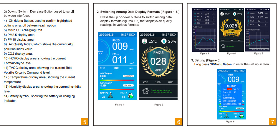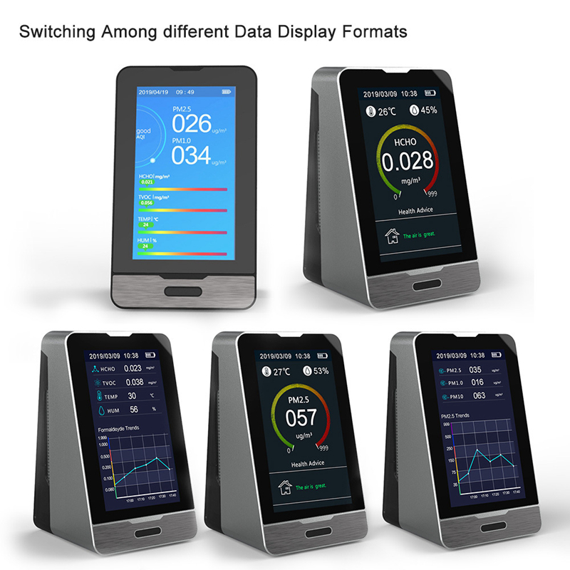 This product is a multifunctional air quality monitor that detects Carbon dioxide (CO2), Formaldehyde (HCHO), Total Volatile Organic Compounds (TVOC), Particulate Matter <2.5 micron-¬sized particles (PM2.5/1.0/10), Temperature, and Humidity with clock and record function. As a scientific air quality detection device, it combines multiple air sensors with a built-in fan to allow real time monitoring of Carbon dioxide (CO2), formaldehyde (HCHO), total volatile organic compounds (TVOC), PM2.5/1.0/10, temperature, and humidity on its digital LCD display.