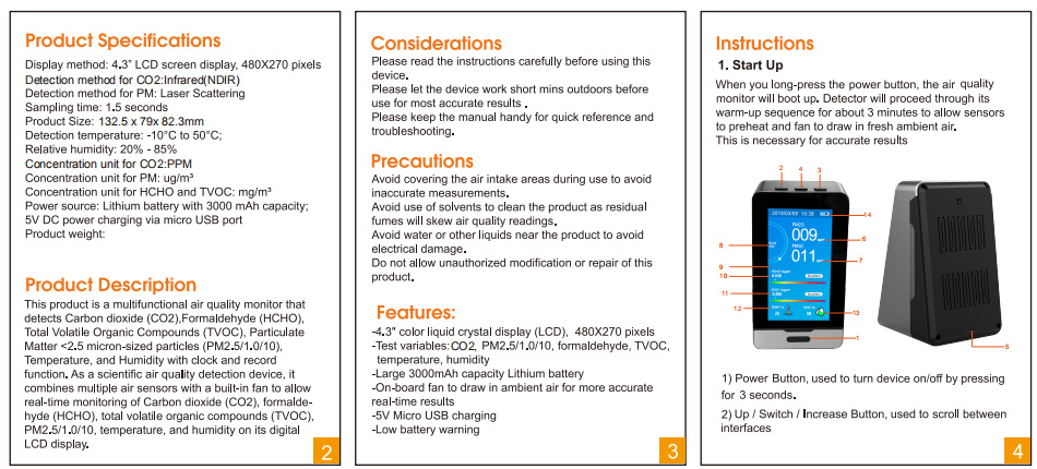 - 4.3" LCD display, 480*270 pixels, simple and elegant, with high test accuracy, stable performance, with clear and easy to understand digital display, let you know the current air quality at a glance.