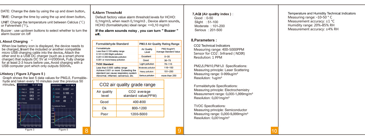 - Alarm threshold: default factory value alarm threshold levels for HCHO: 0.1mg/m³. When reach 0.1mg/m³, Device alarm sounds. HCHO ideal range: <=0.10mg/m³.
