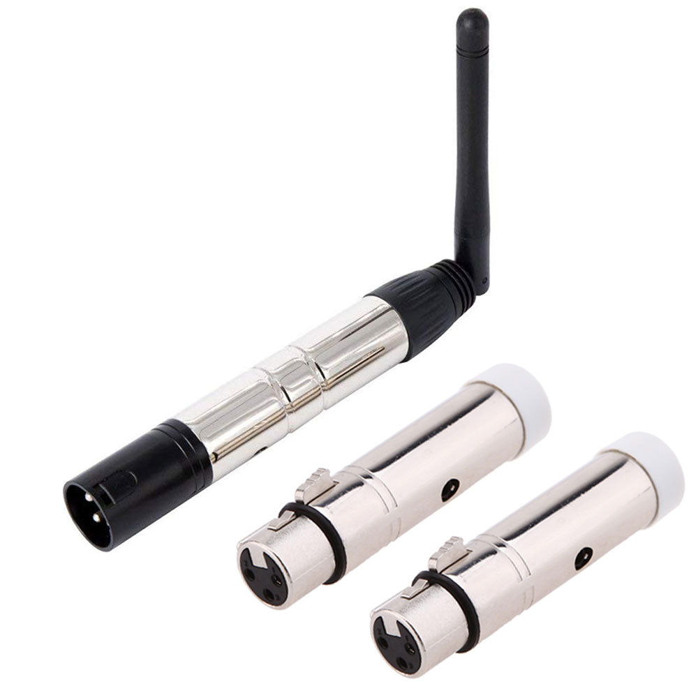 This product features a 3-pin male and a 3-pin female port. The male plug of the transmitter connects to the console, while the female plug of the receiver connects to the light. One transmitter can control up to 512 channels of lights.
