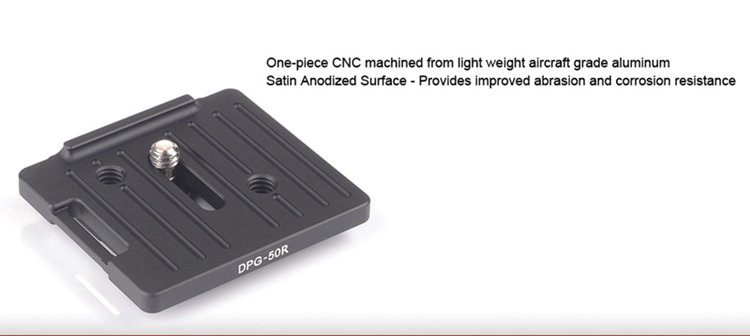 DPG-50R universal quick release plate, one piece CNC cutting machined from light weight aircraft-grade aluminum, stain anodized surface finish for better abrasion and corrosion resistant. For Arca-Swiss style, ideal for Canon 5D, 5DII, 7D, etc.