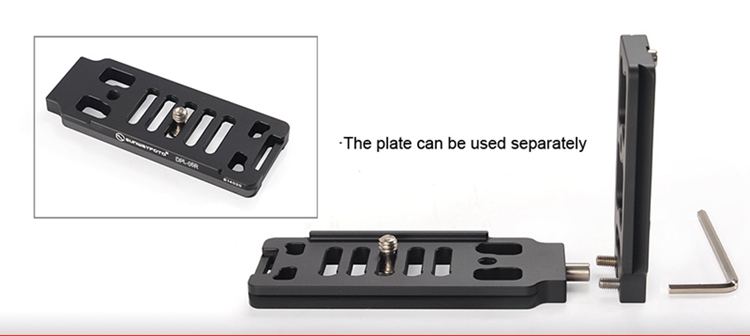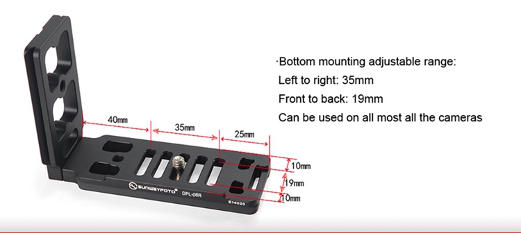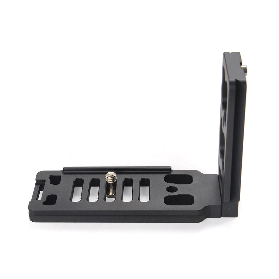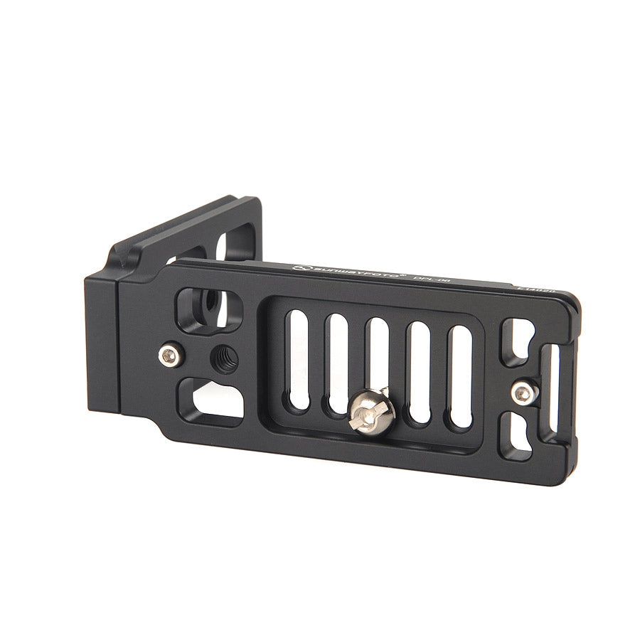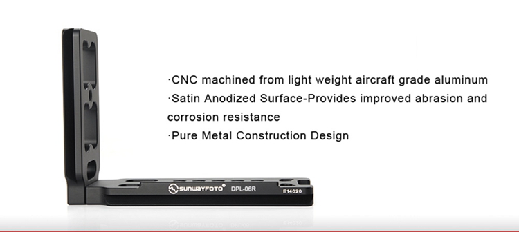 DPL-06R universal L bracket, one piece CNC cutting machined from light weight aircraft-grade aluminum, stain anodized surface finish for better abrasion and corrosion resistant. For Arca-Swiss style. Ideal for a variety of traditional 135/120 SLR film cameras and digital SLR cameras without remote cable.