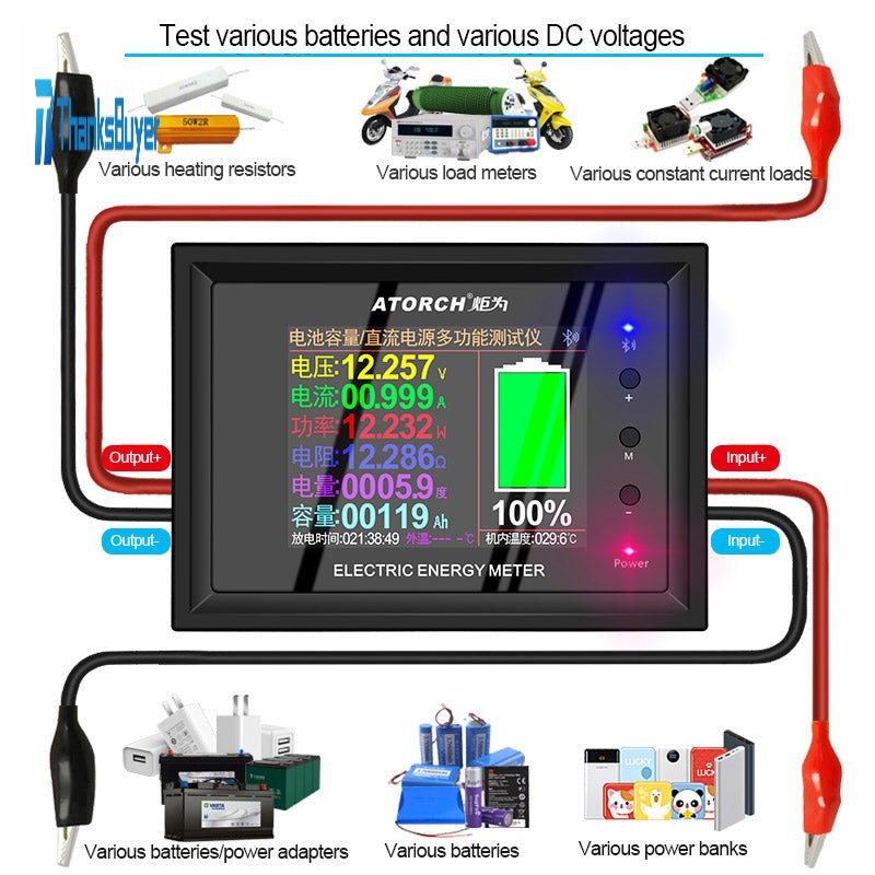 -Battery capacity/DC power supply tester: suitable for various power adapters, batteries, constant current loads, power banks, etc., to test voltage, current, power, capacity, electricity, temperature, resistance, unit price of electricity supply, and cumulative electricity fee , CO2 and other parameters and operations.