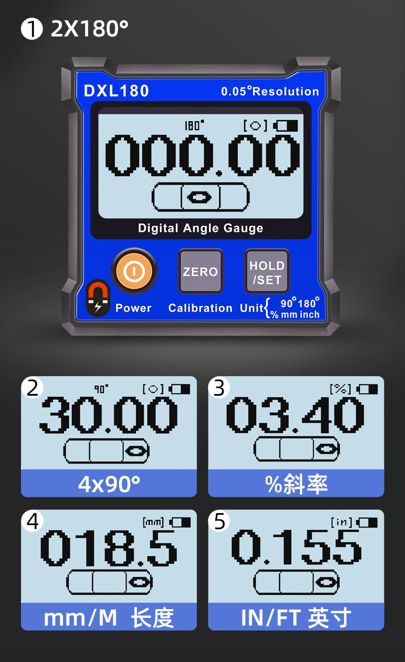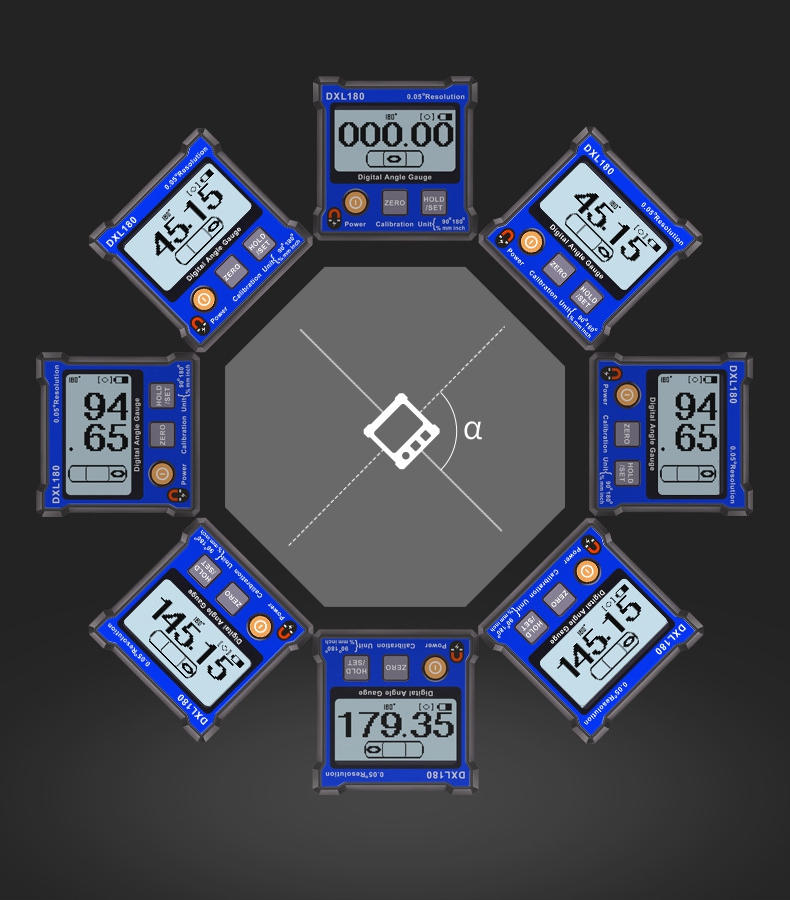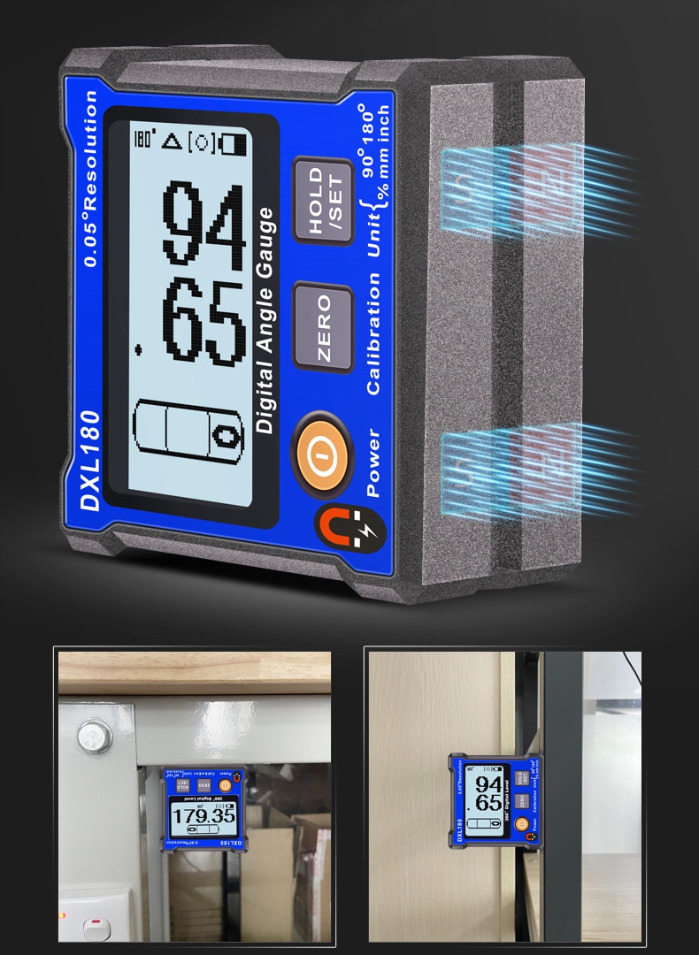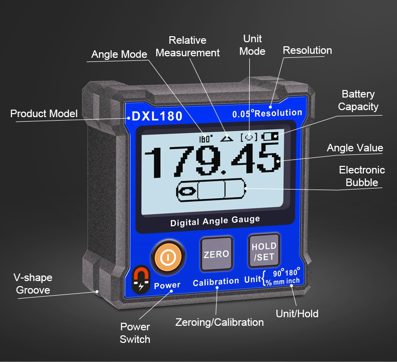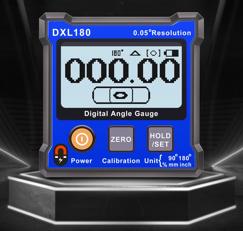 - The DXL180 is a digital angle gauge that can display multiple units, supporting readings in angle, slope, inches, and mm/M units. The measurement range is 2x 0-180° and 4x 0-90°, and the instrument has four strong magnets on the bottom measurement reference plane. The V-shaped groove design makes it easy to place circular pipes for testing. Supports IP42 dustproof and waterproof, with M4 screw holes reserved on the back for easy installation and fixation.