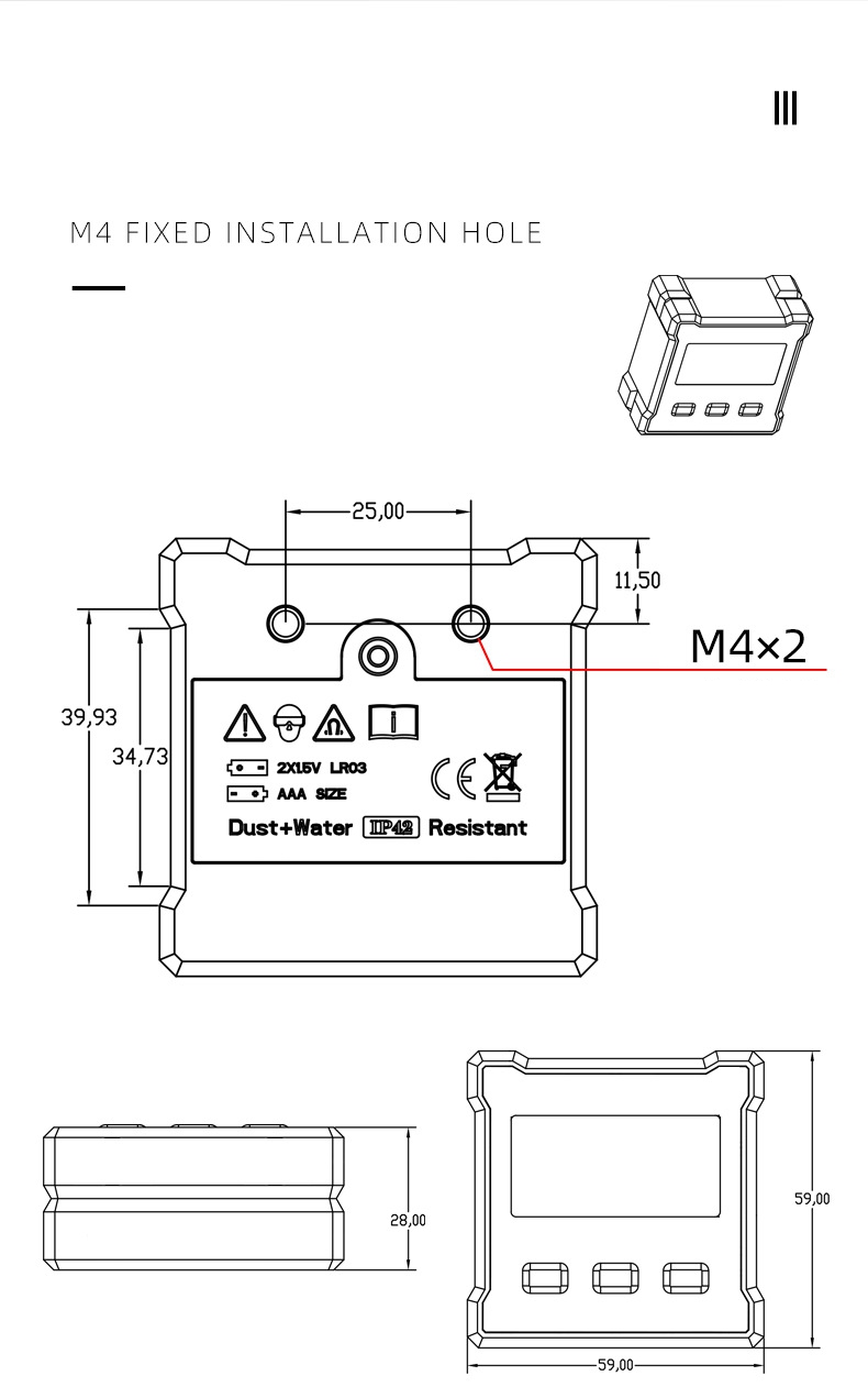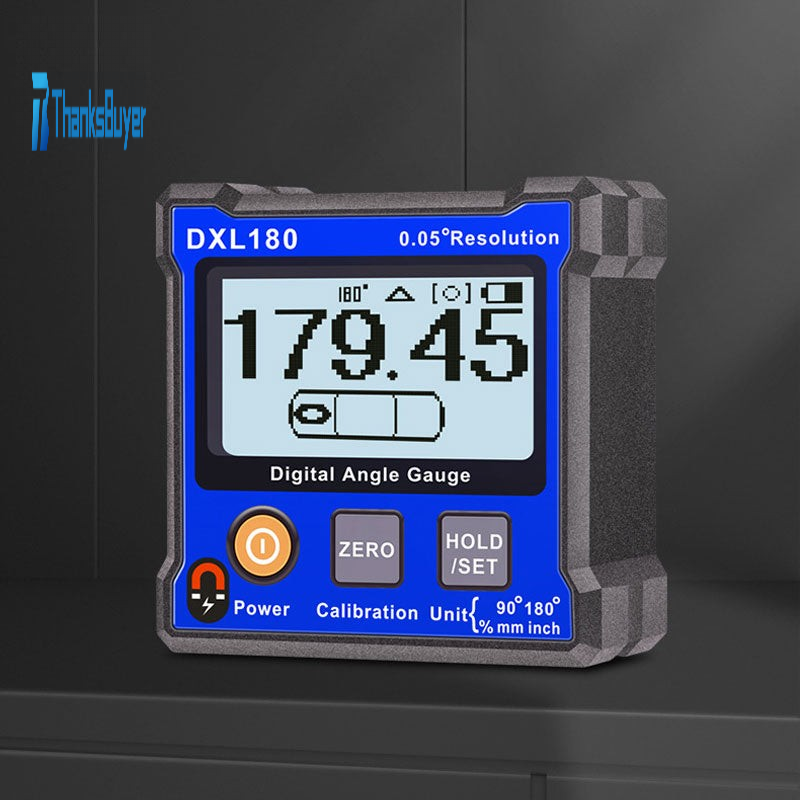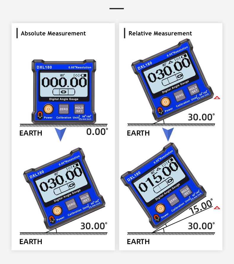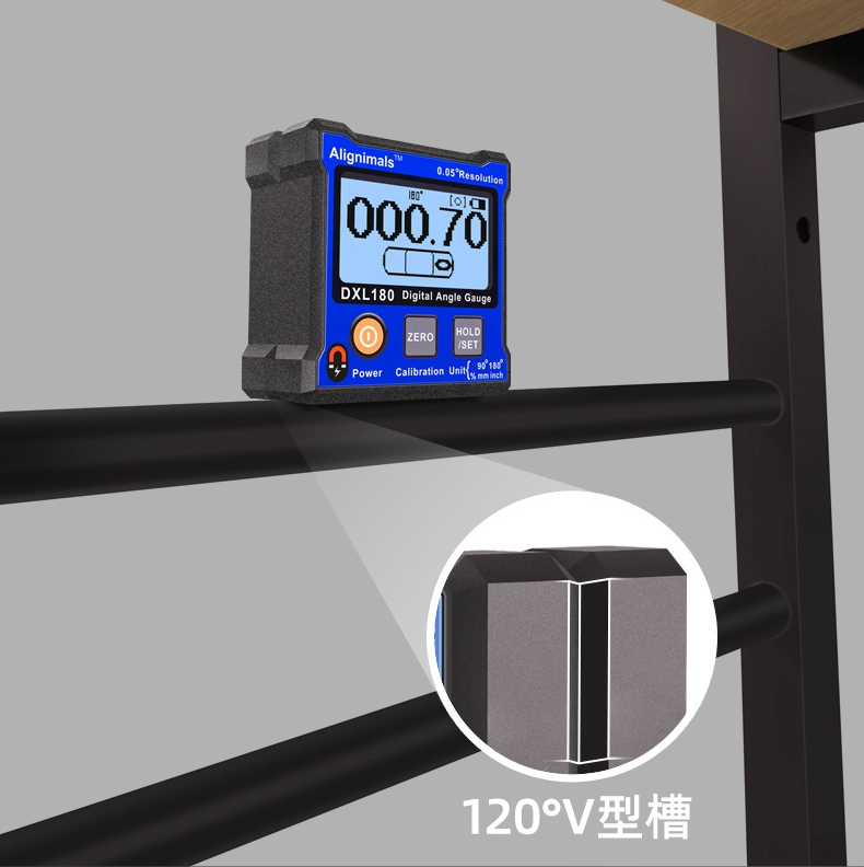 - The DXL180 is a digital angle gauge that can display multiple units, supporting readings in angle, slope, inches, and mm/M units. The measurement range is 2x 0-180° and 4x 0-90°, and the instrument has four strong magnets on the bottom measurement reference plane. The V-shaped groove design makes it easy to place circular pipes for testing. Supports IP42 dustproof and waterproof, with M4 screw holes reserved on the back for easy installation and fixation.